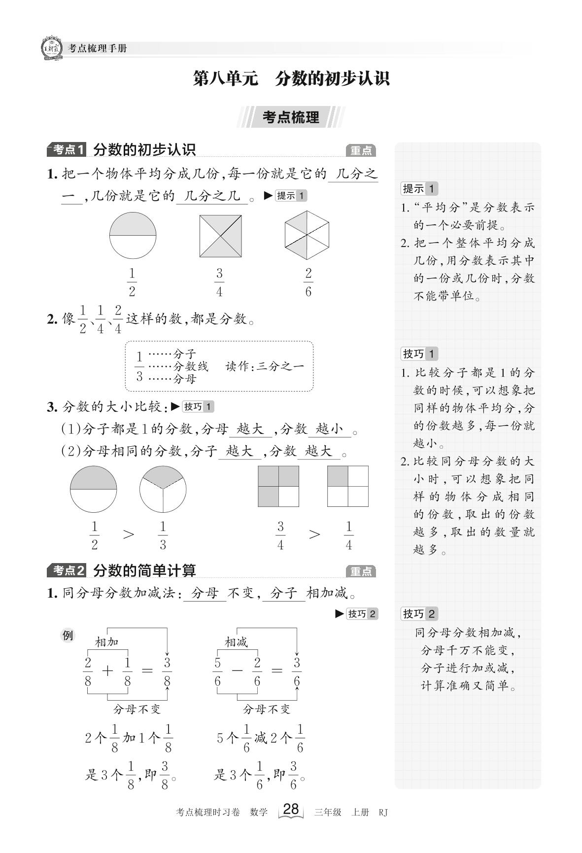 2023上册三年级数学人教版 考点梳理手册——第八单元 分数的初步认识