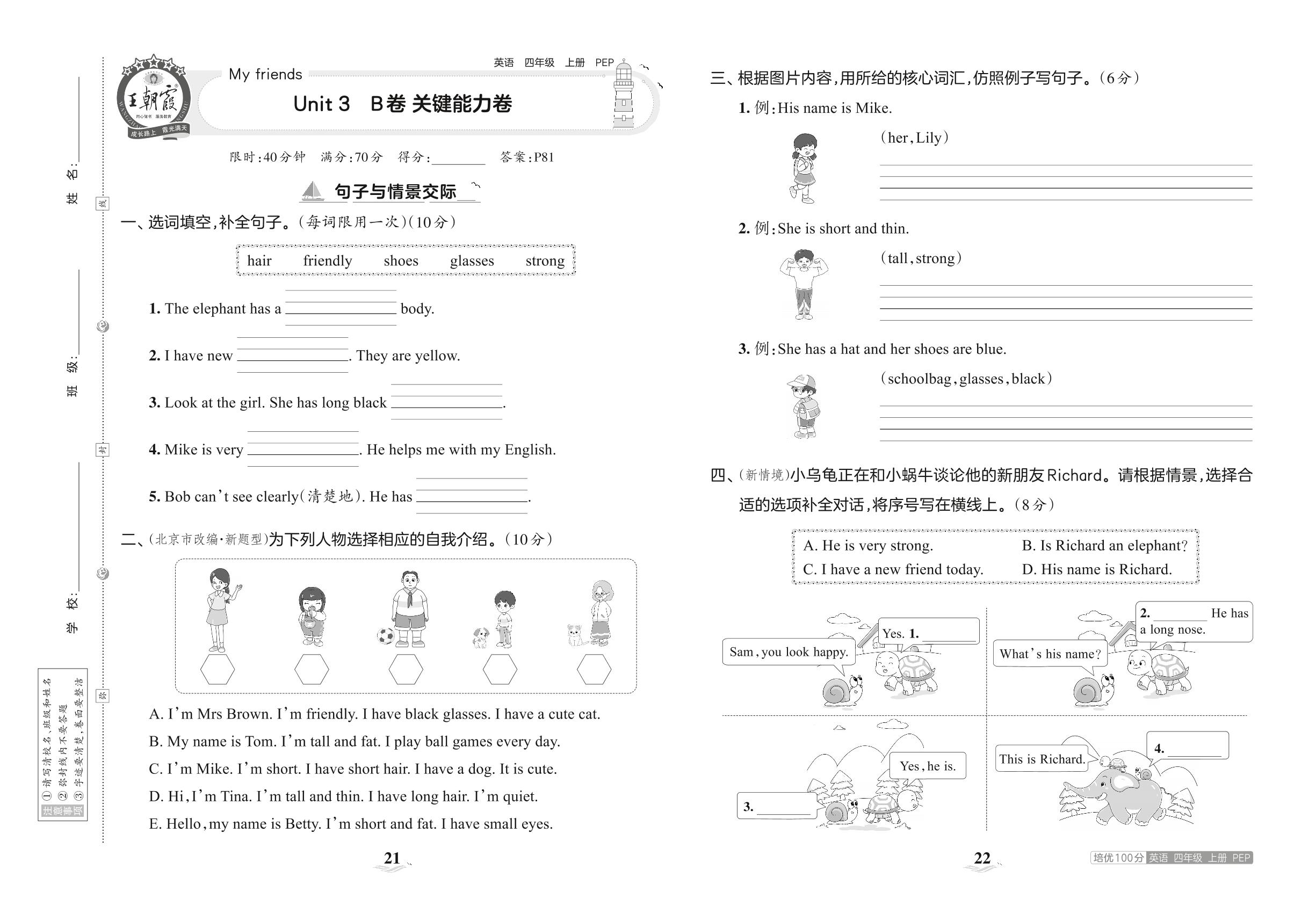 2023上册四年级英语人教PEP版 Unit 3 B卷 关键能力卷