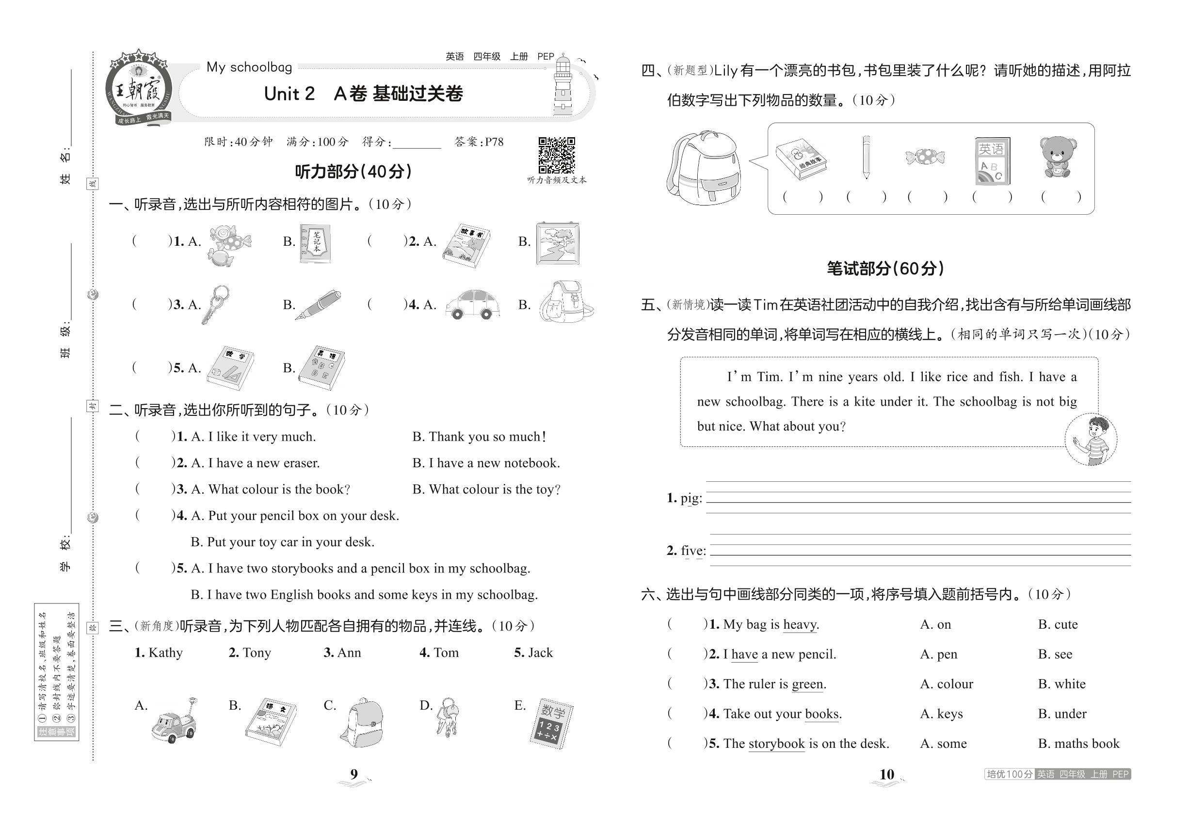 四年级英语人教PEP版(三起始)上册单元卷