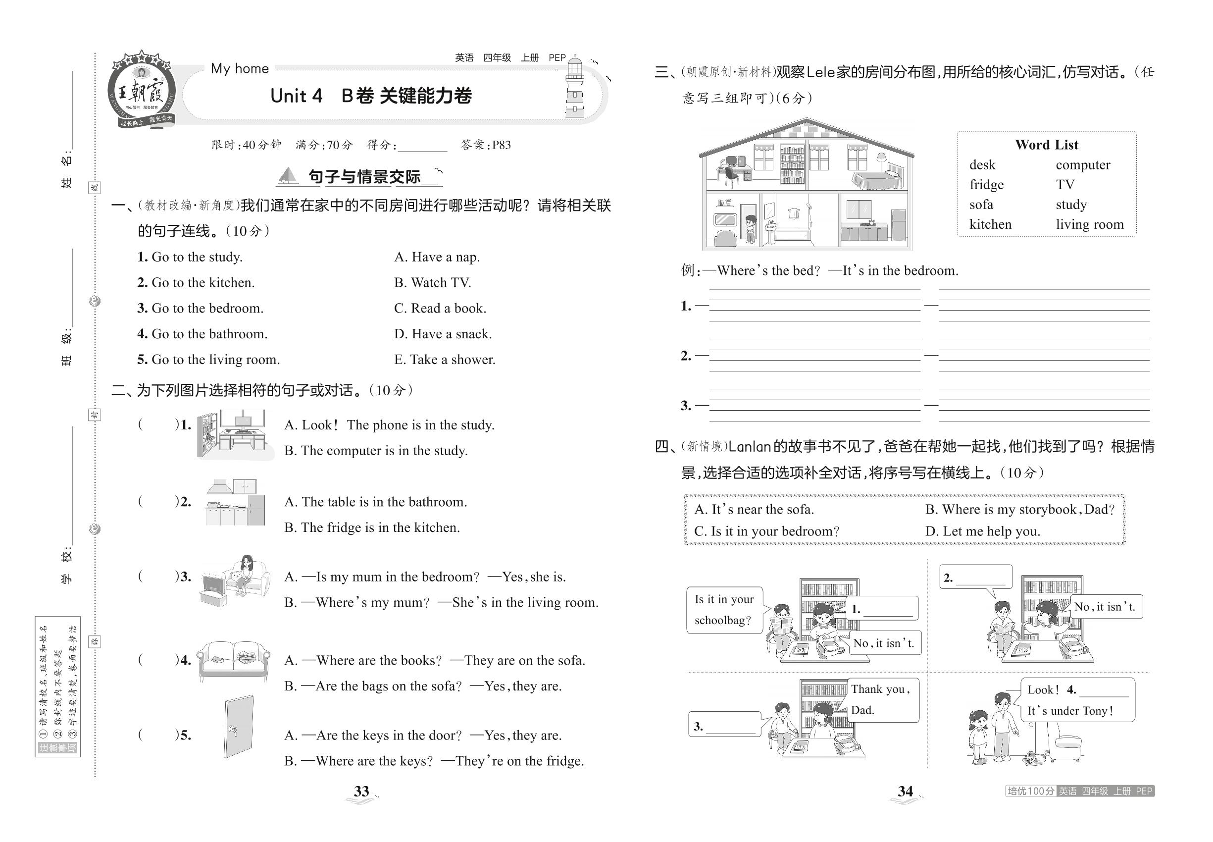 2023上册四年级英语人教PEP版 Unit 4 B卷 关键能力卷