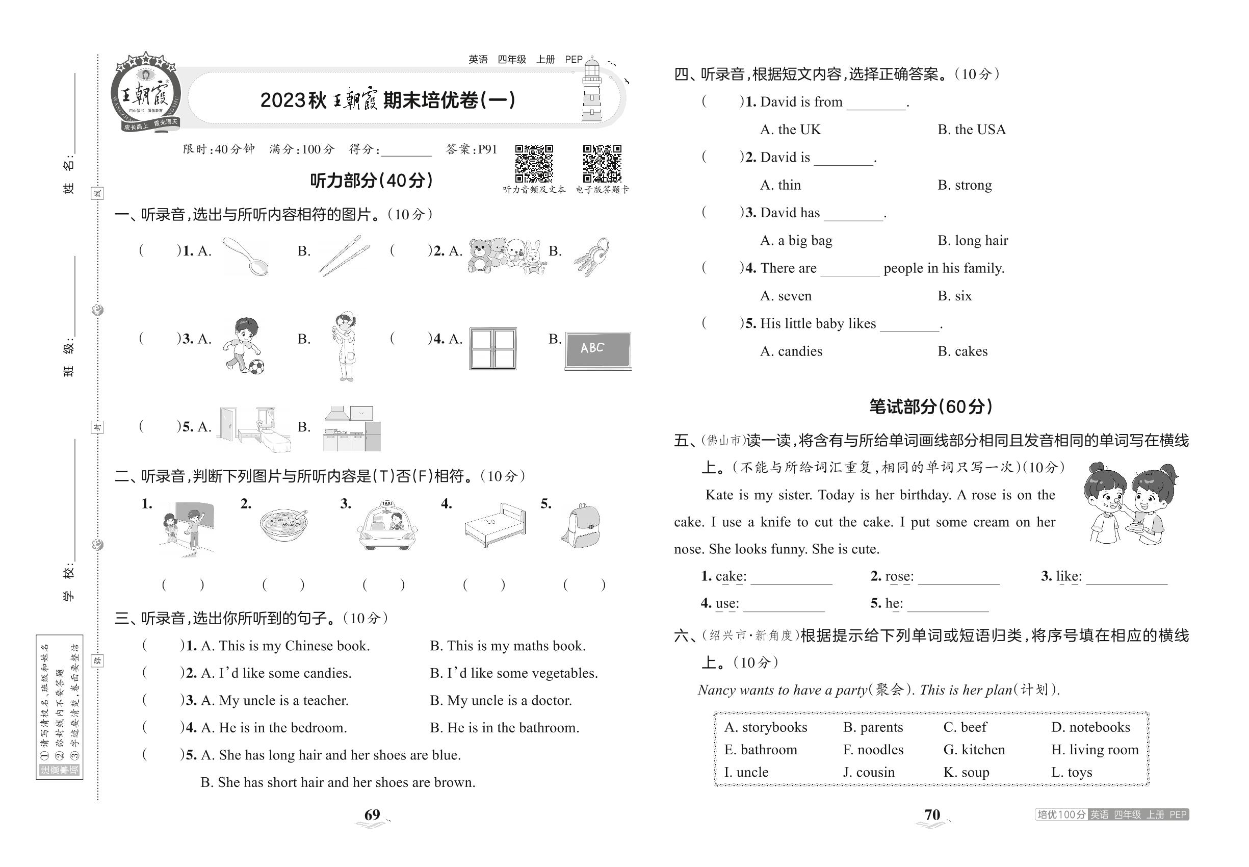2023上册四年级英语人教PEP版 2023秋王朝霞期末培优卷(一)