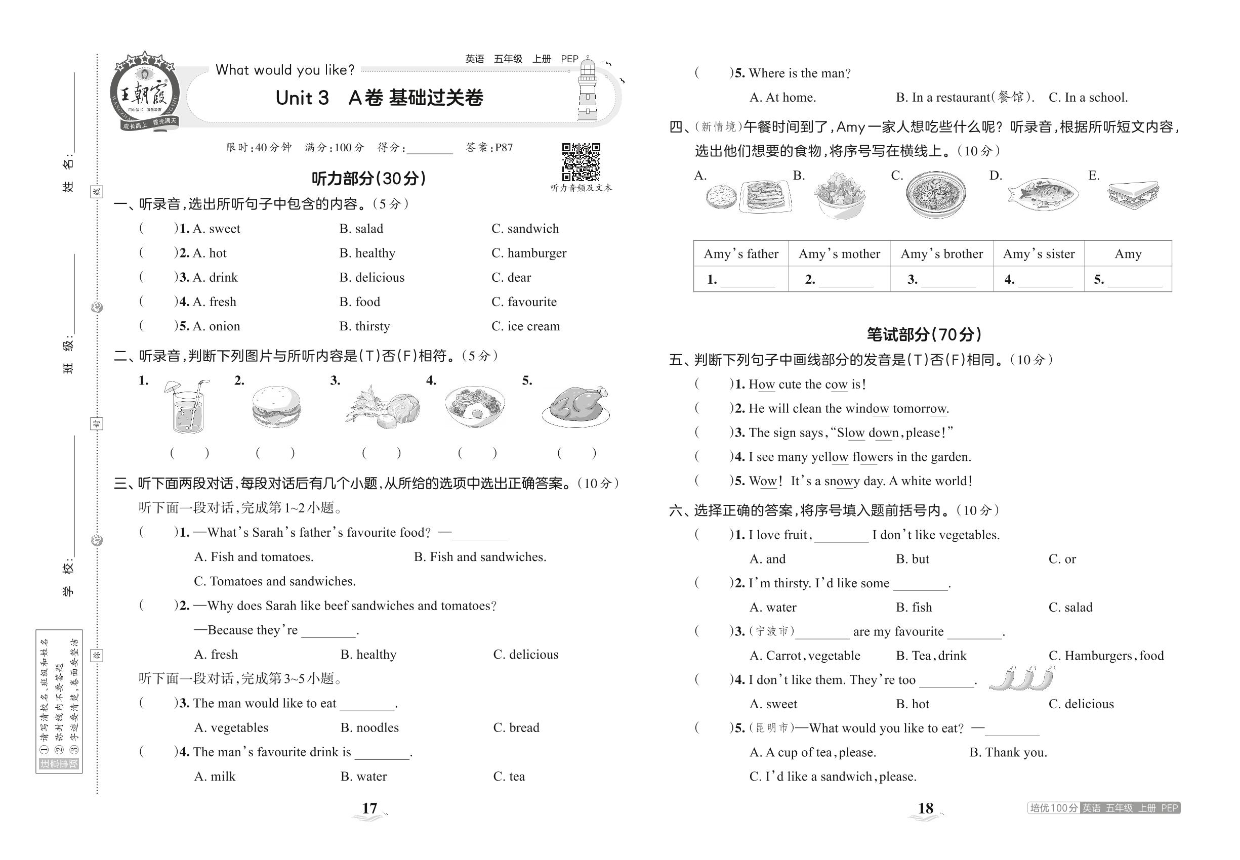 五年级英语人教PEP版(三起始)上册单元卷
