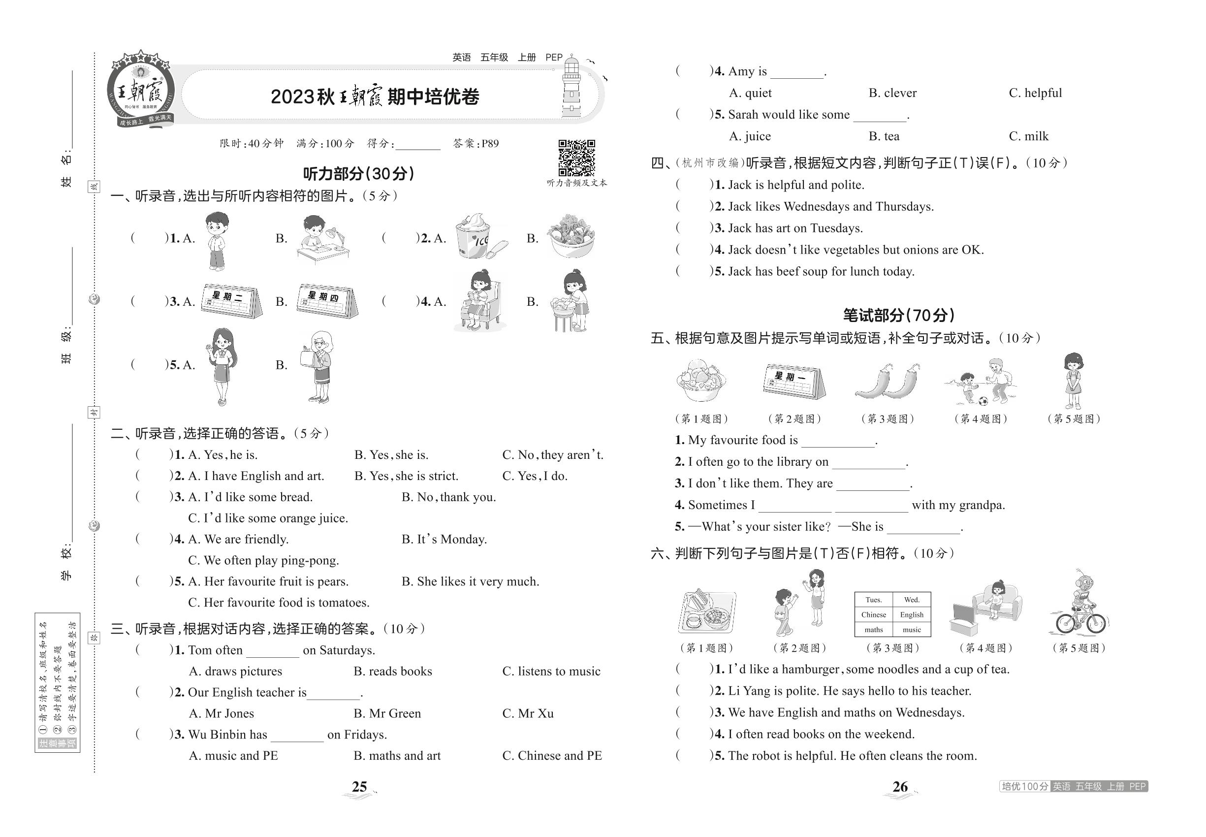 2023上册五年级英语人教PEP版 2023秋王朝霞期中培优卷