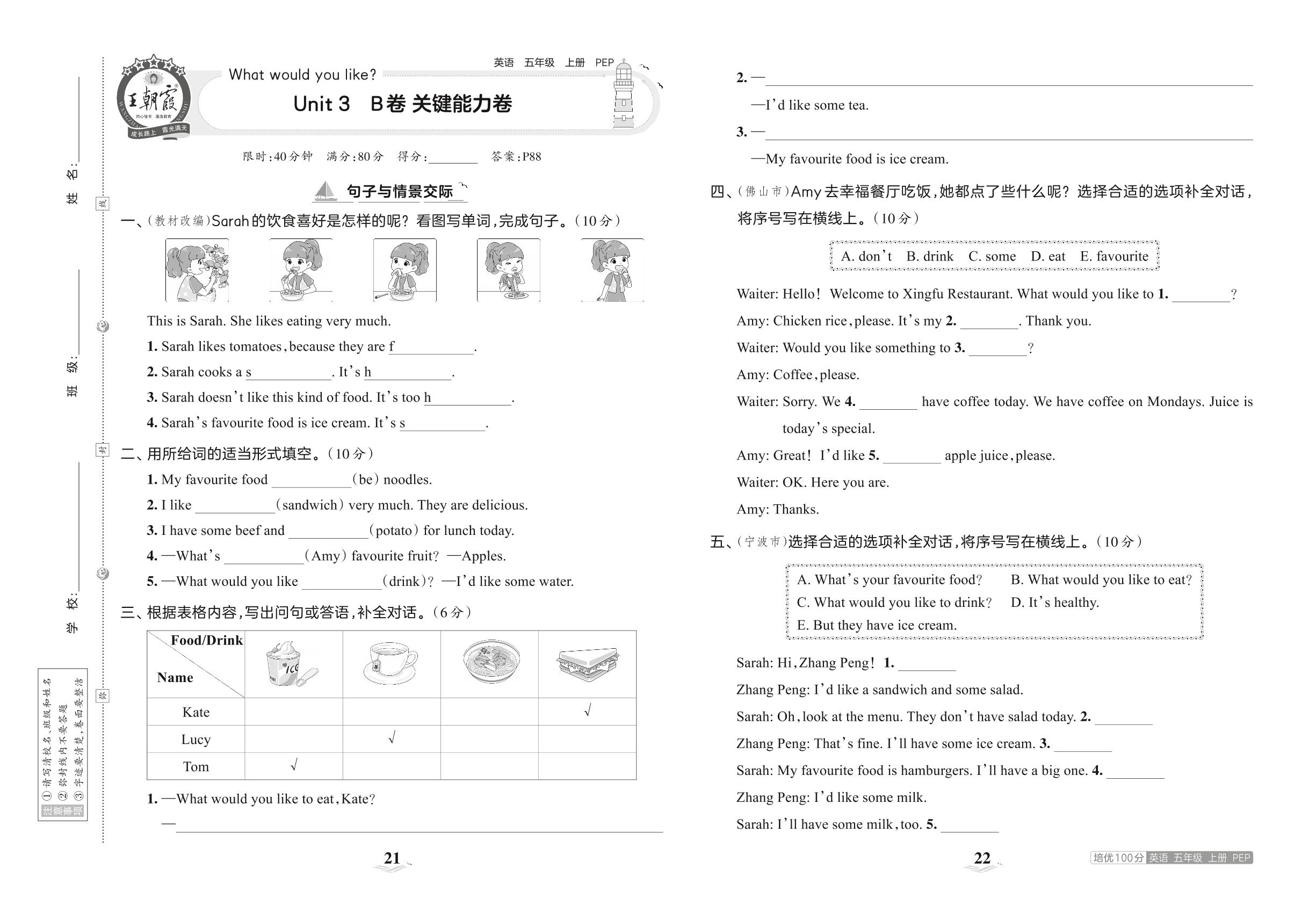 2023上册五年级英语人教PEP版 Unit 3 B卷 关键能力卷