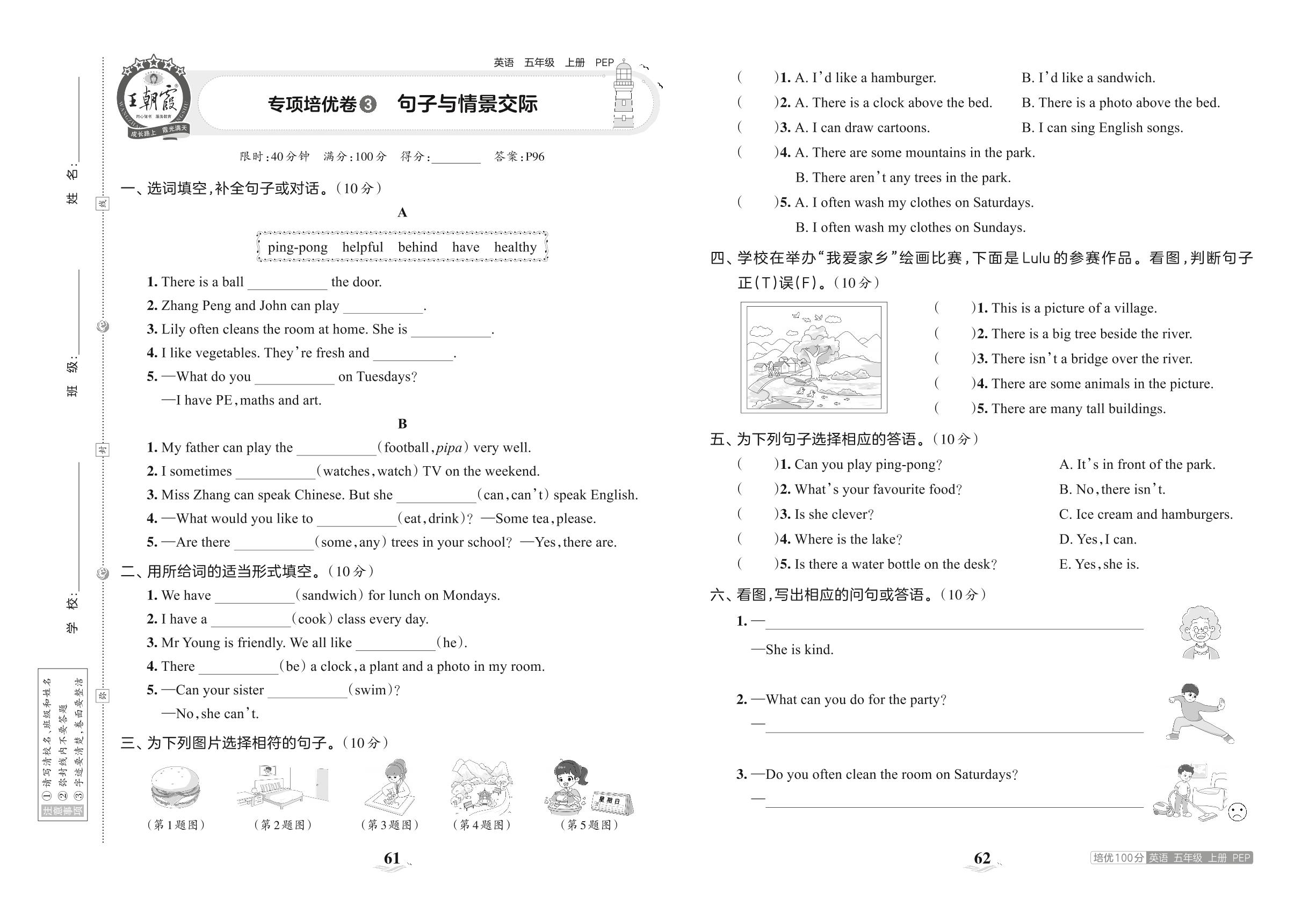 2023上册五年级英语人教PEP版 专项培优卷 3 句子与情景交际