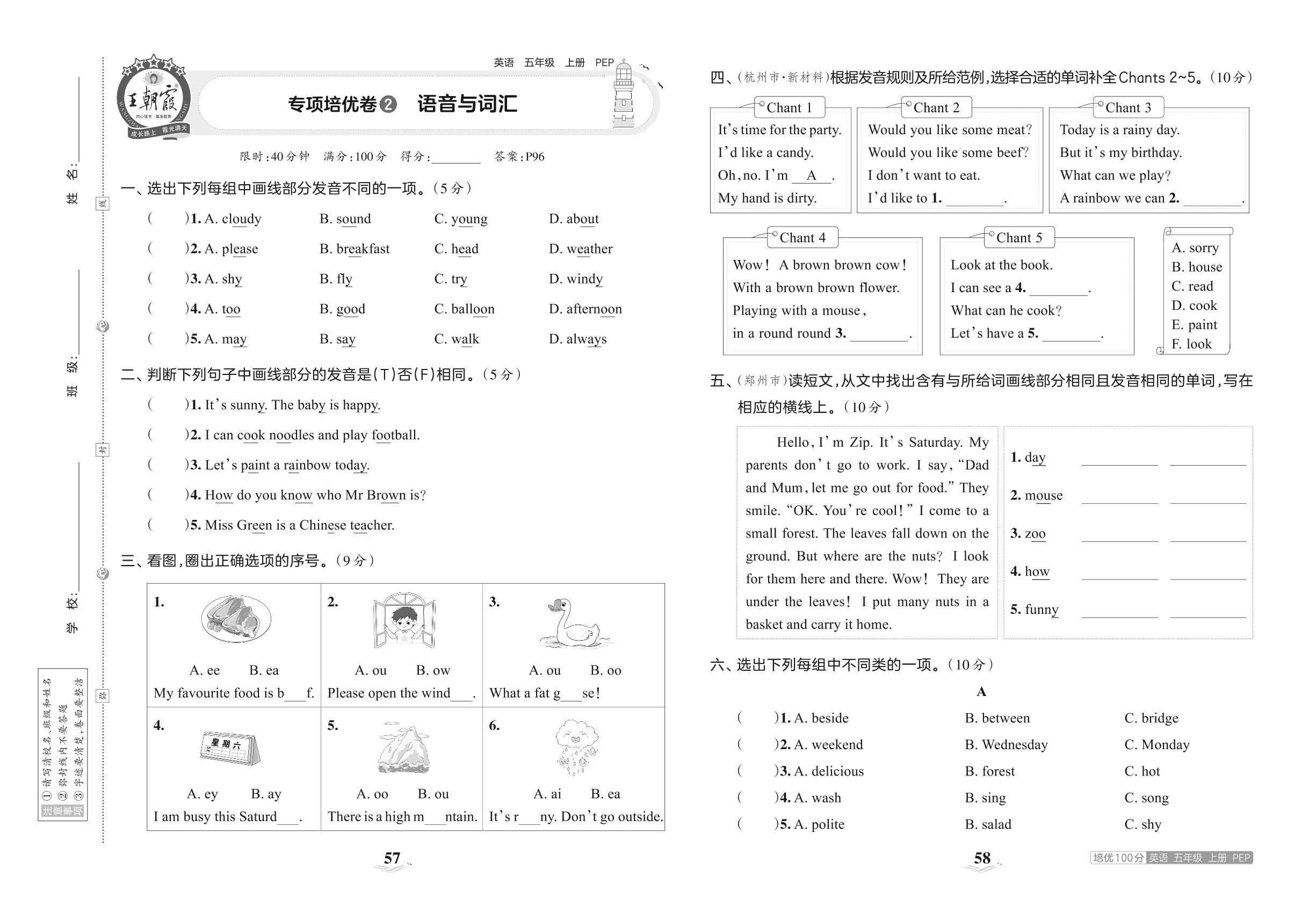2023上册五年级英语人教PEP版 专项培优卷 2 语音与词汇