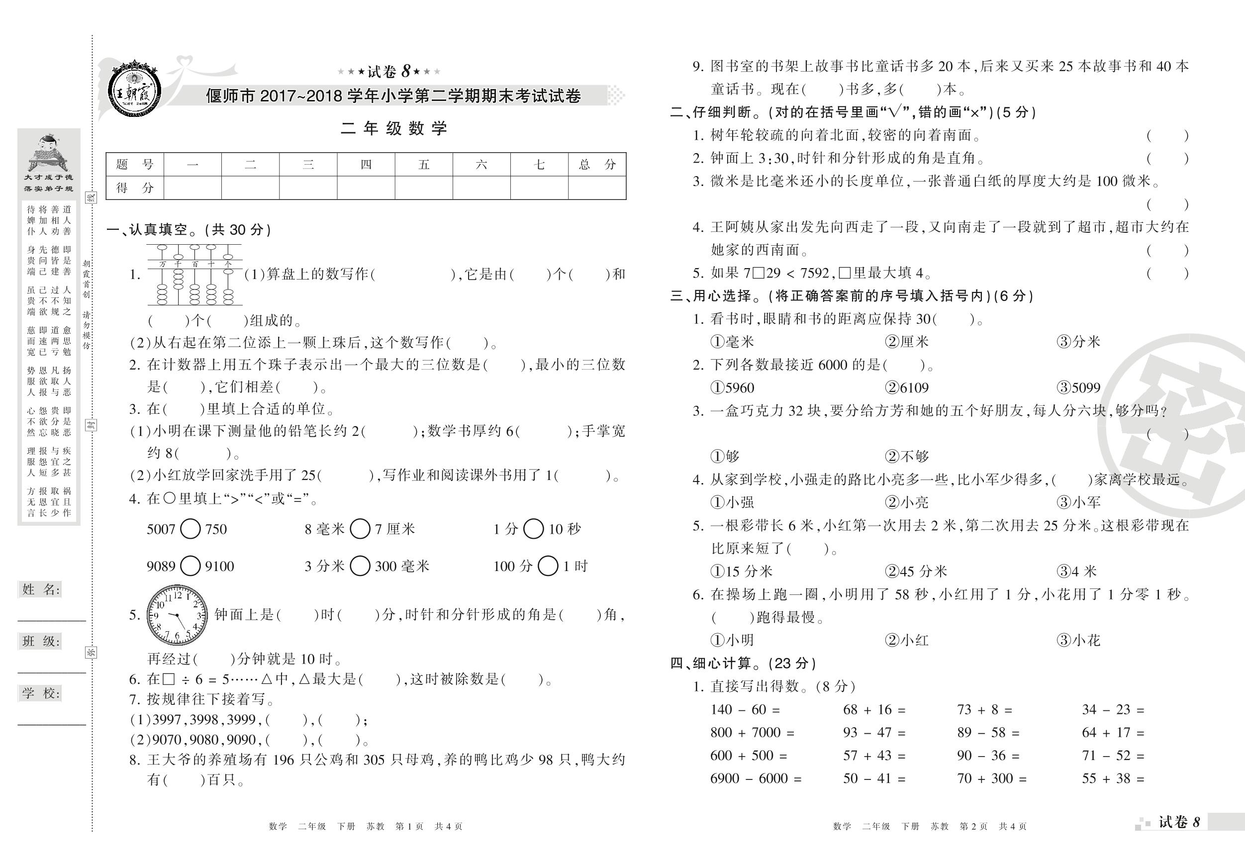 2017-2018学年第二学期偃师市二年级数学试卷(苏教版)【8】