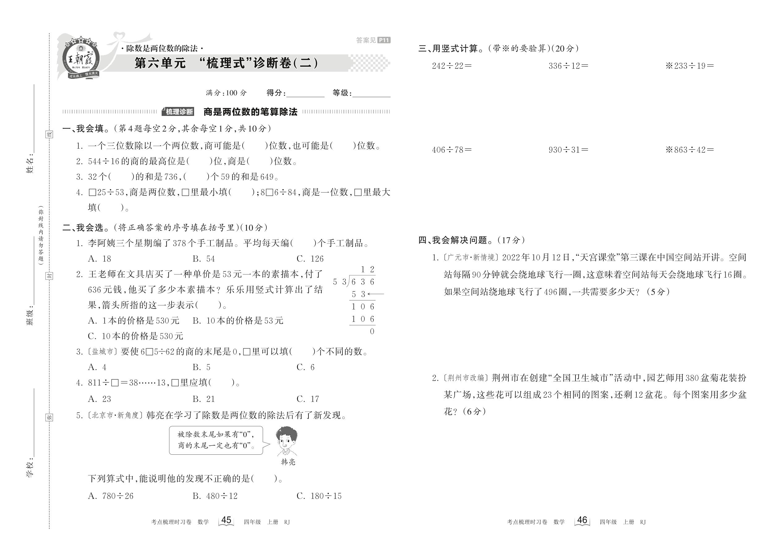 2023上册四年级数学人教版 第六单元 “梳理式”诊断卷(二)