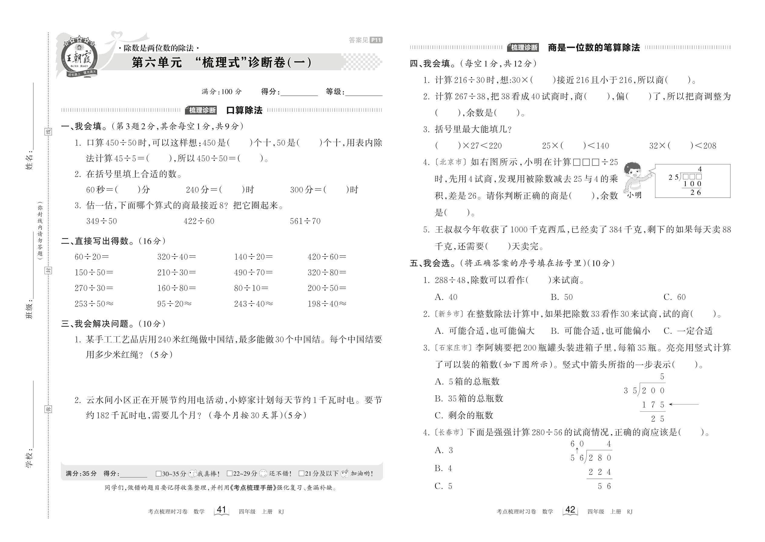 2023上册四年级数学人教版 第六单元 “梳理式”诊断卷(一)