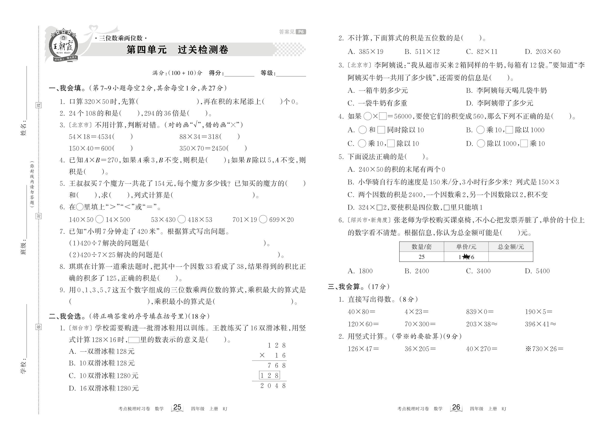 2023上册四年级数学人教版 第四单元 过关检测卷