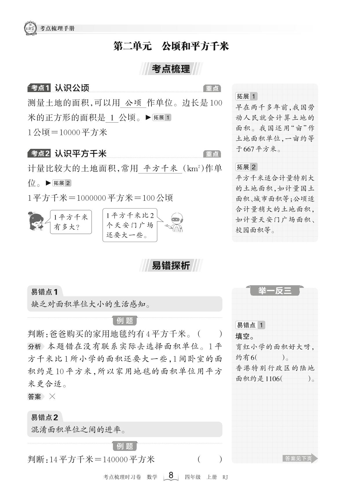 2023上册四年级数学人教版 考点梳理手册——第二单元 公顷和平方千米