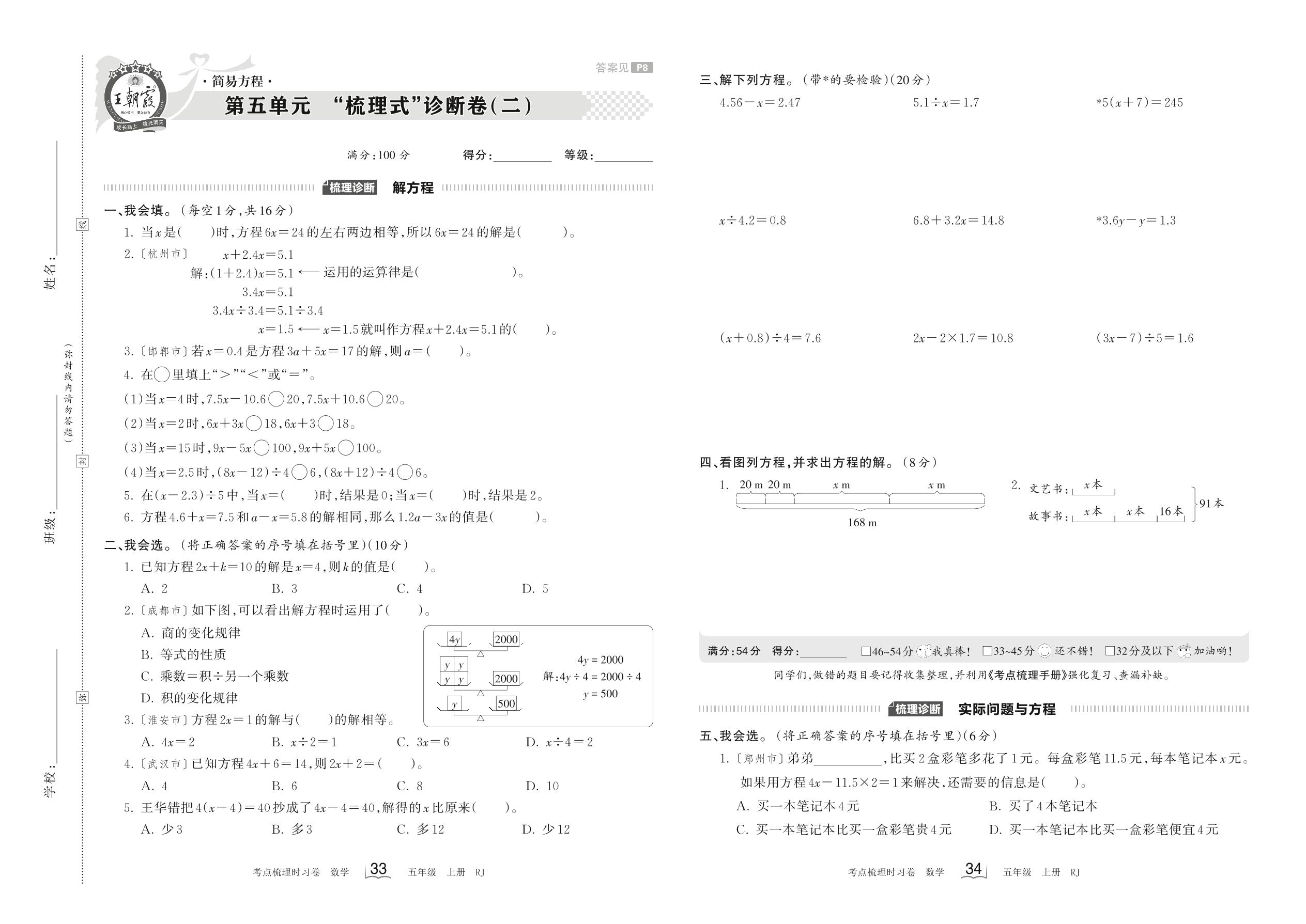 2023上册五年级数学人教版 第五单元 “梳理式”诊断卷(二)