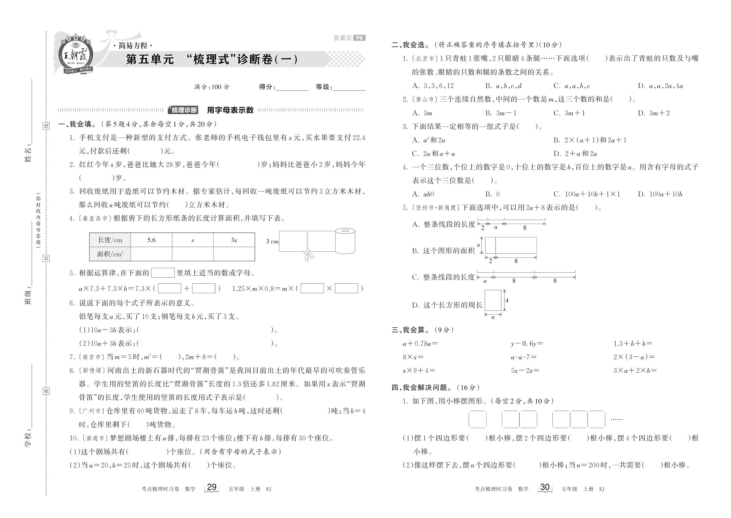 2023上册五年级数学人教版 第五单元 “梳理式”诊断卷(一)