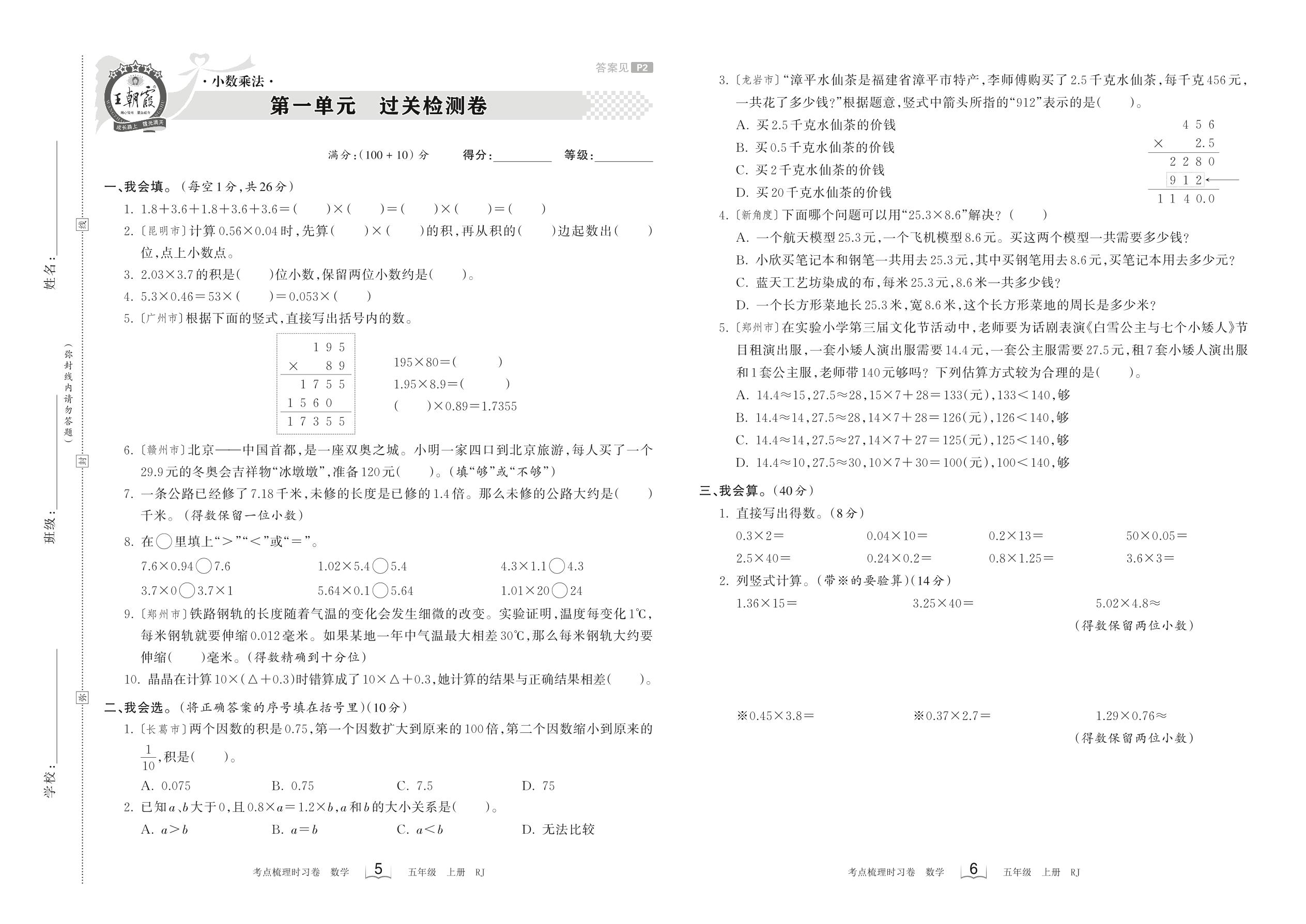 2023上册五年级数学人教版 第一单元 过关检测卷