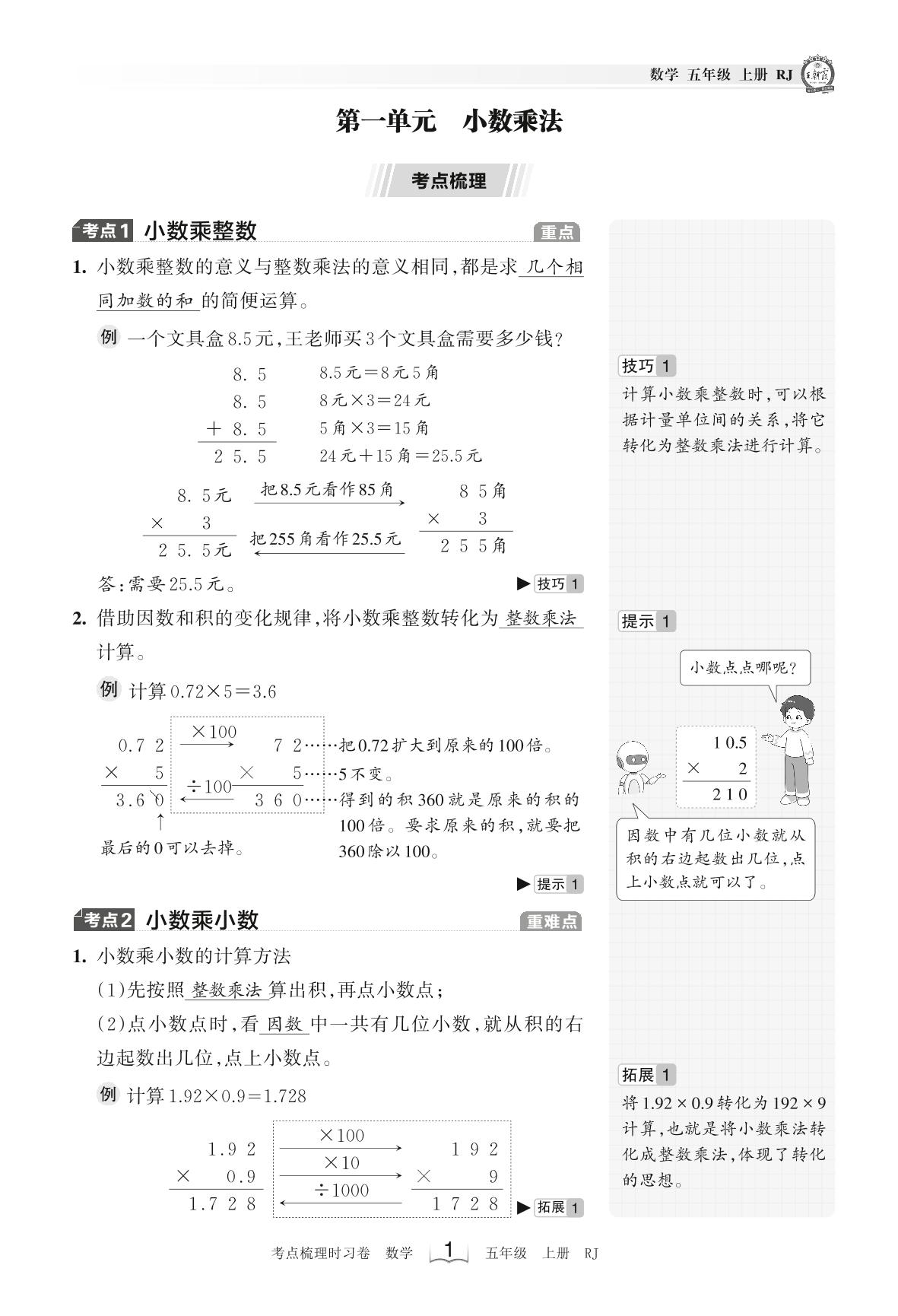 2023上册五年级数学人教版 考点梳理手册——第一单元 小数乘法