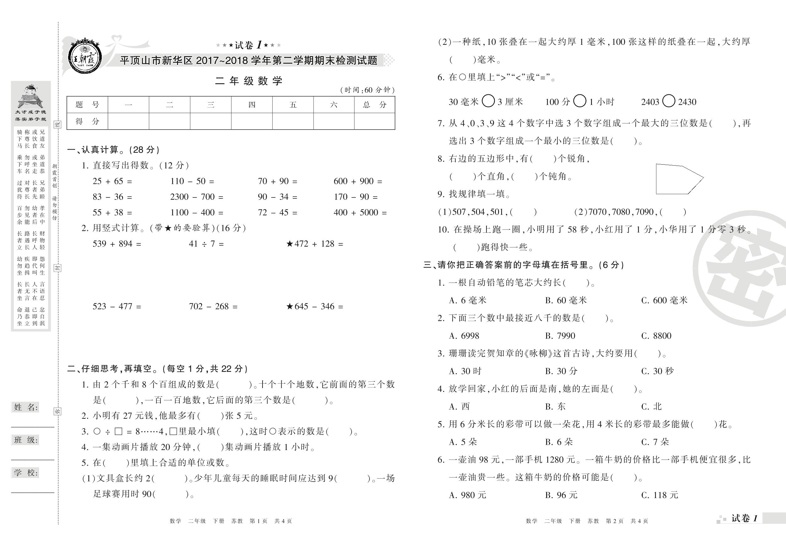 2017-2018学年第二学期平顶山市新华区二年级数学试卷(苏教版)_R21080392628【1】