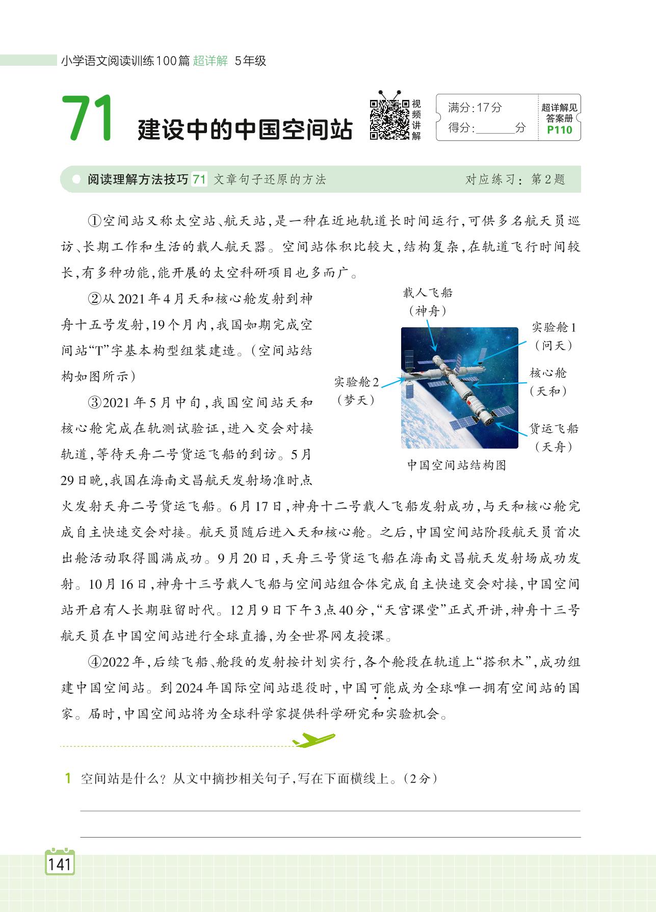 2024全一册五年级语文人教版 专题六 说明文 71 建设中的中国空间站
