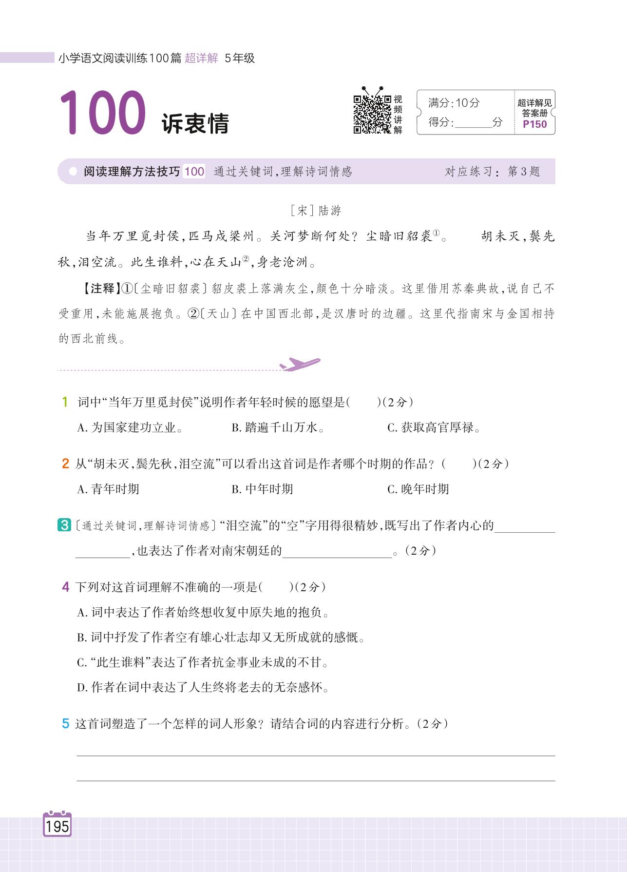 2024全一册五年级语文人教版 专题九 古诗文 100 诉衷情