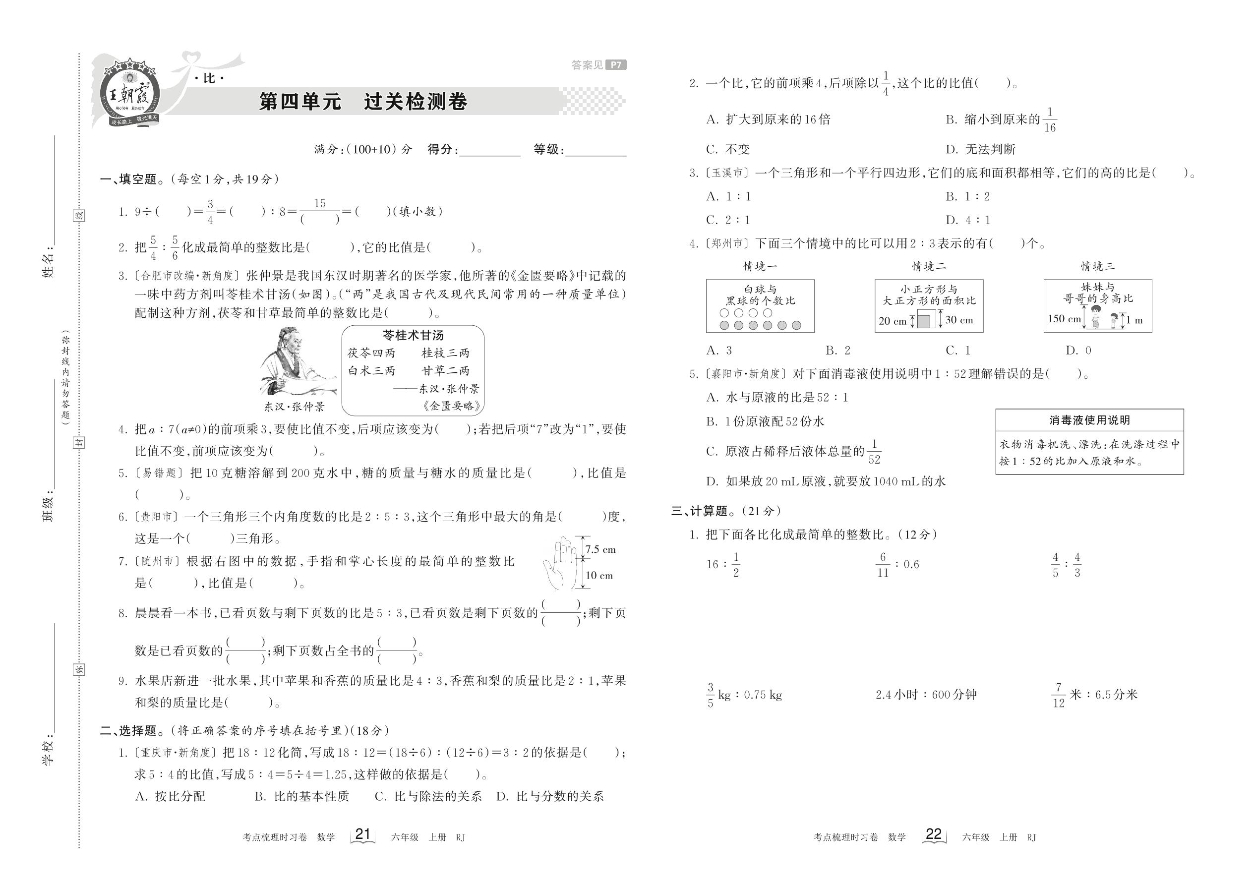 2023上册六年级数学人教版 第四单元 过关检测卷