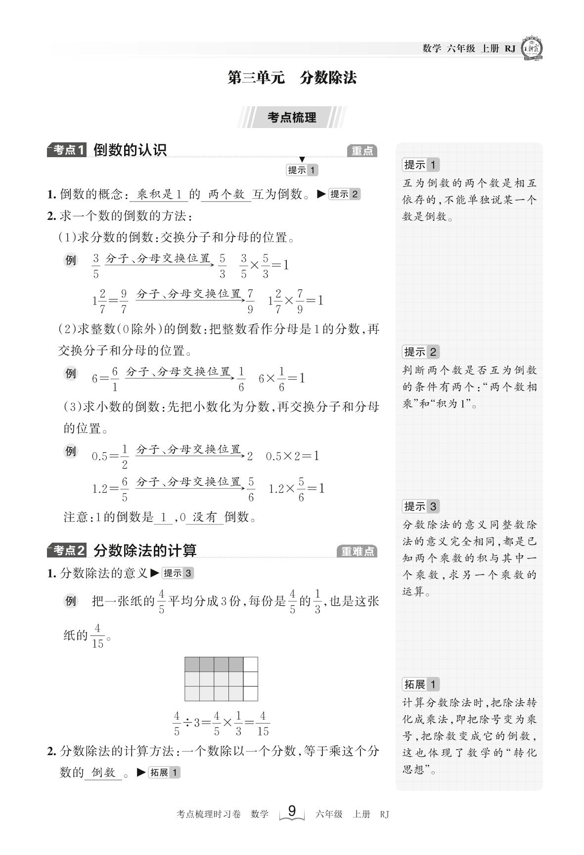 2023上册六年级数学人教版 考点梳理手册——第三单元 分数除法
