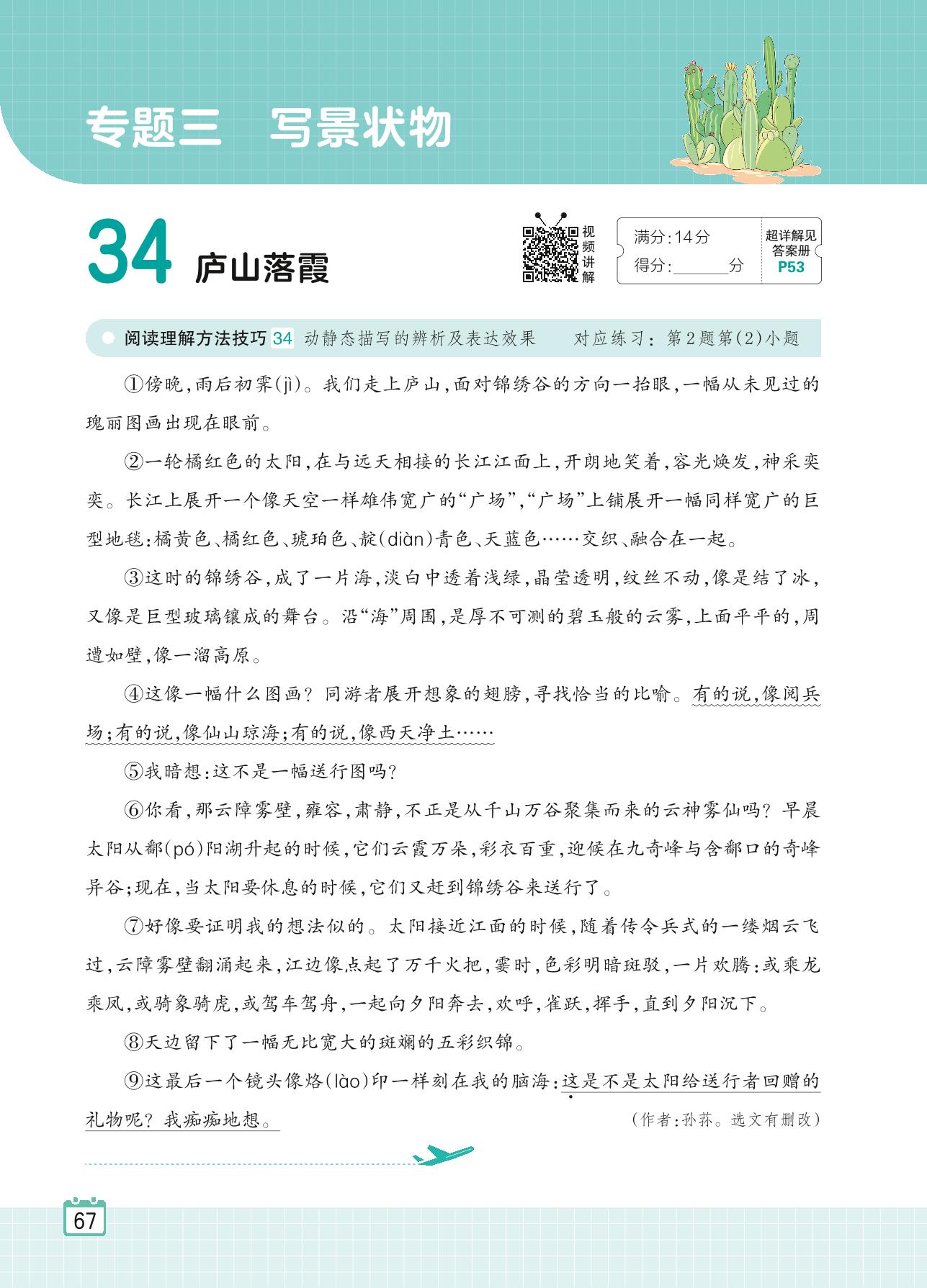 2024全一册五年级语文人教版 专题三 写景状物 34 庐山落霞