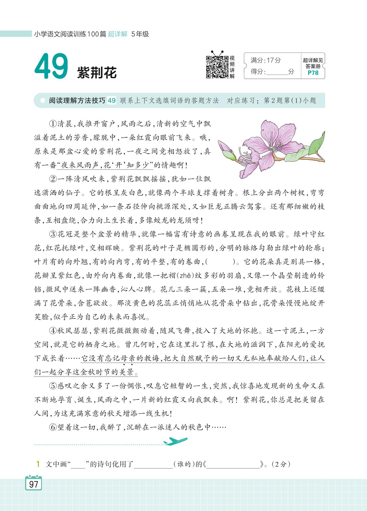 2024全一册五年级语文人教版 专题三 写景状物 49 紫荆花