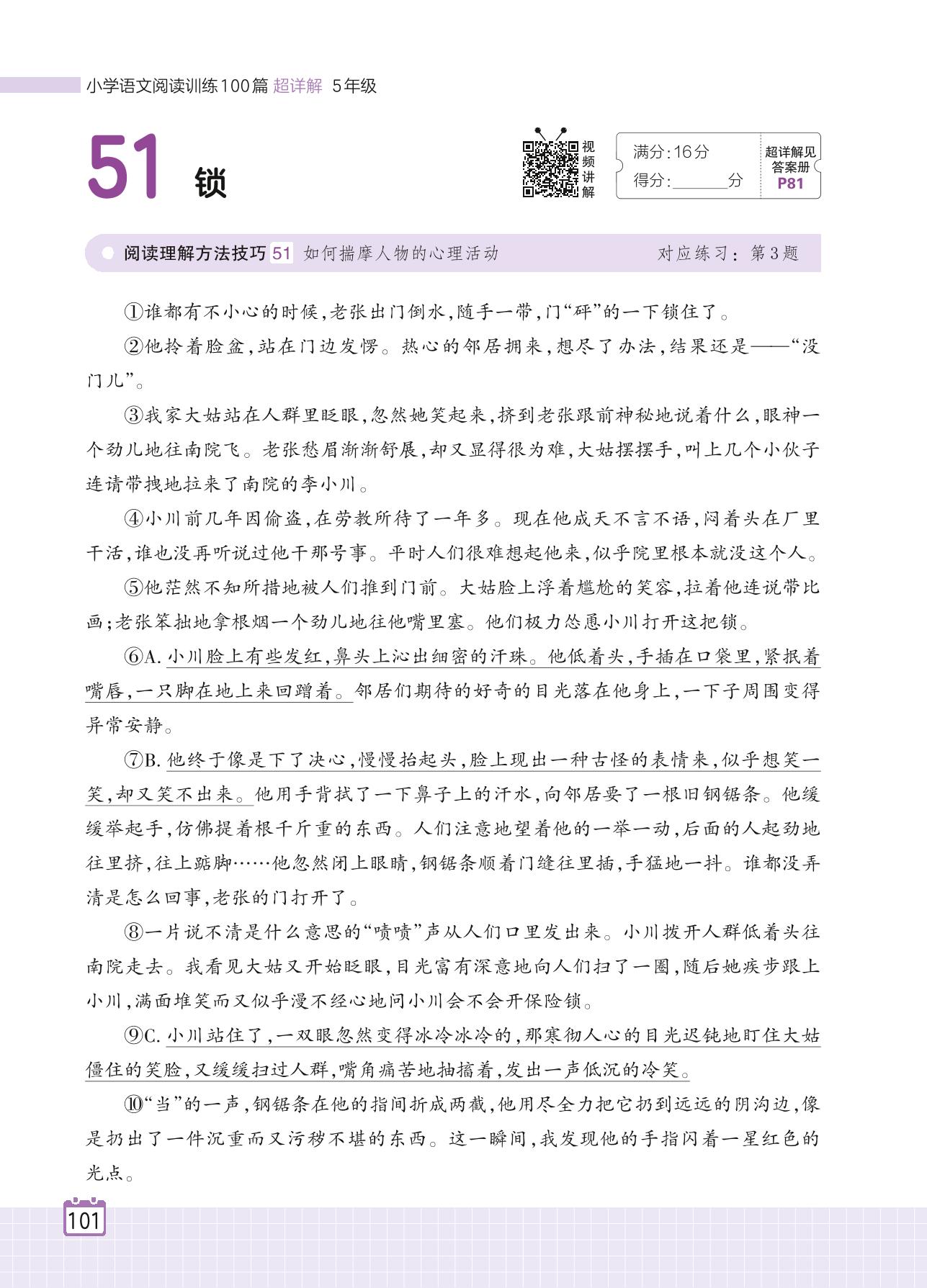 2024全一册五年级语文人教版 专题四 小说 51 锁