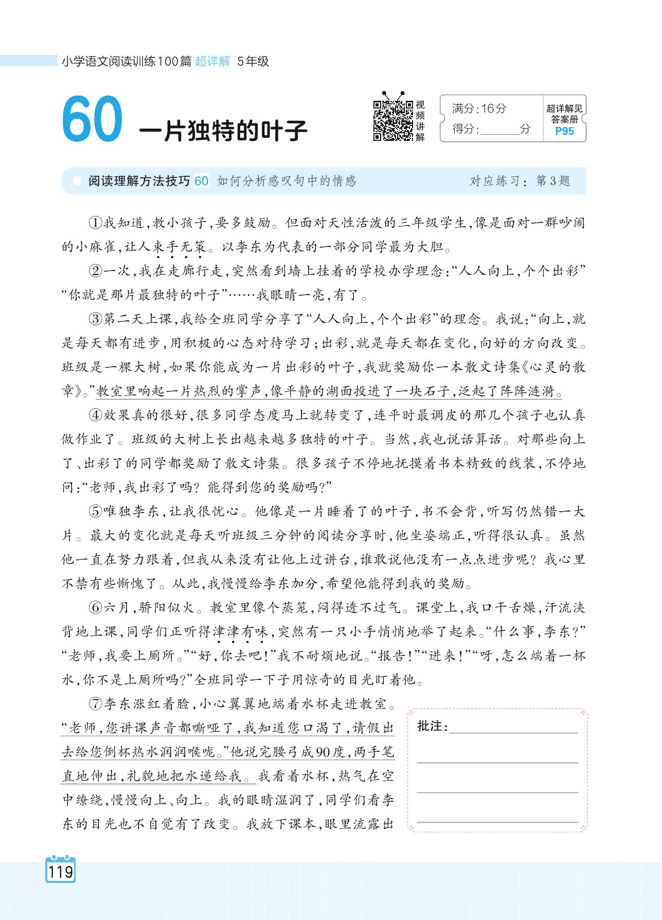 2024全一册五年级语文人教版 专题五 散文 60 一片独特的叶子