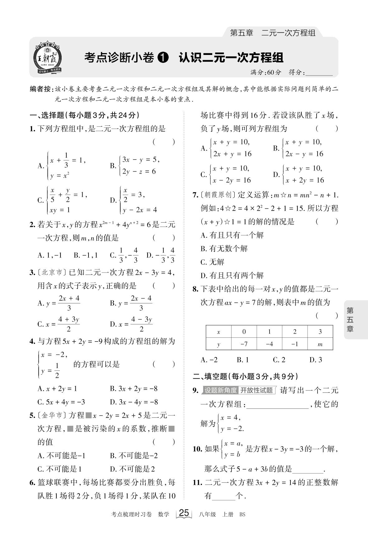 2023上册八年级数学北师版 第五章 考点诊断小卷1 认识二元一次方程组