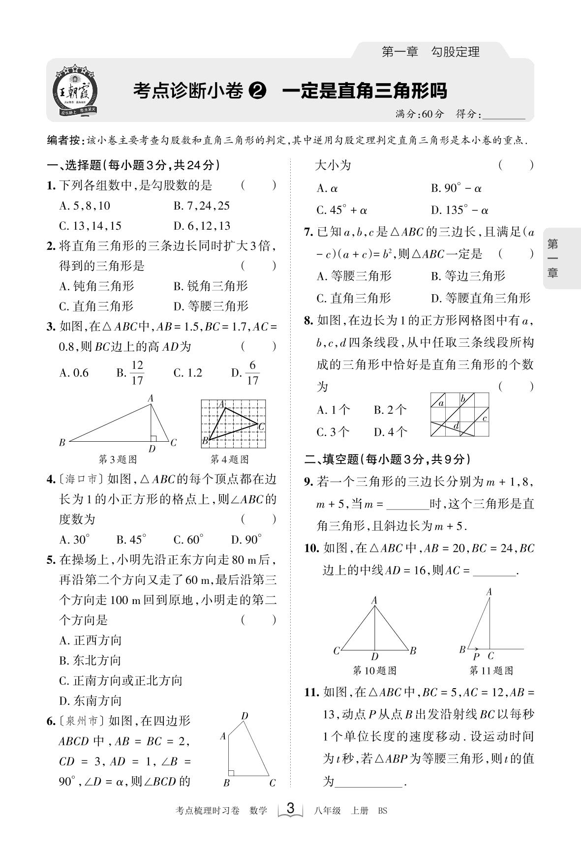 2023上册八年级数学北师版 第一章 考点诊断小卷2 一定是直角三角形吗
