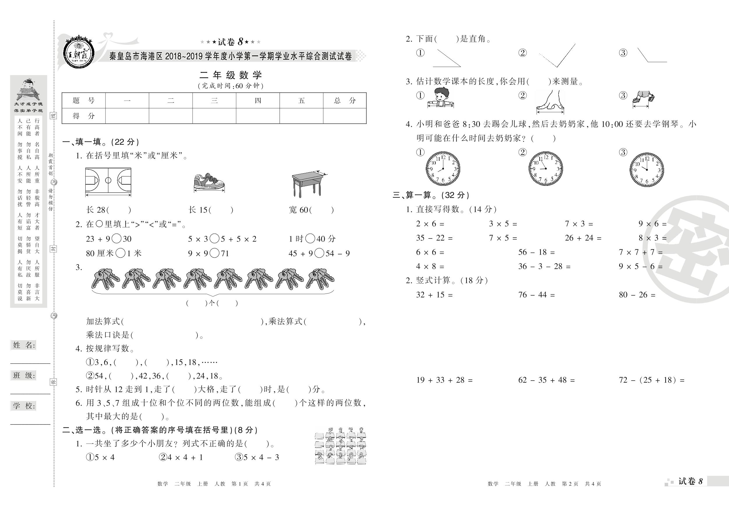 2018-2019学年第一学期秦皇岛市海港区二年级数学试卷(人教版)【8】