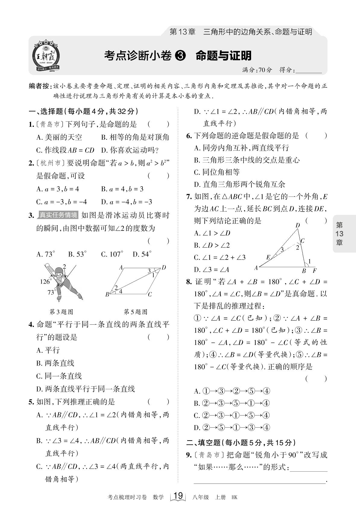 2023上册八年级数学沪科版 第13章 考点诊断小卷3 命题与证明