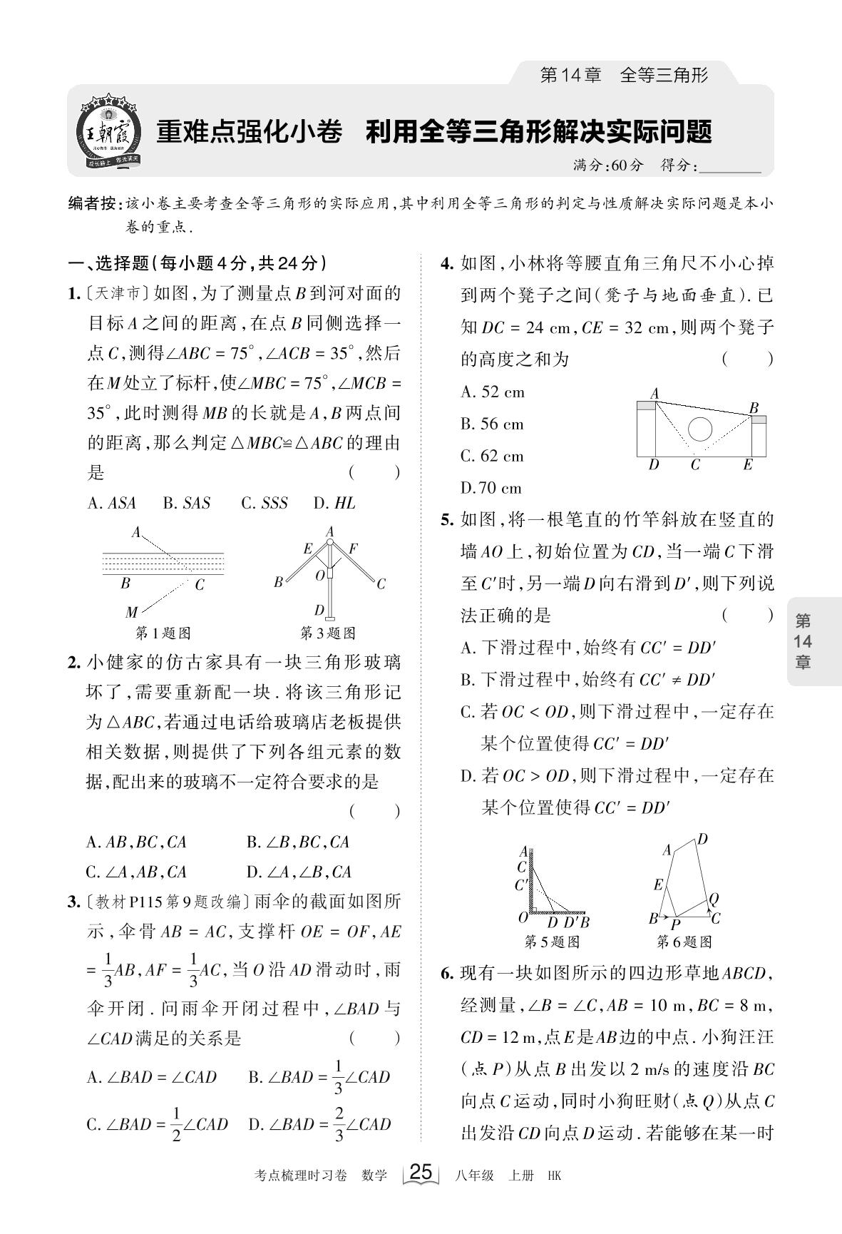 2023上册八年级数学沪科版 第14章 重难点强化小卷 利用全等三角形解决实际问题