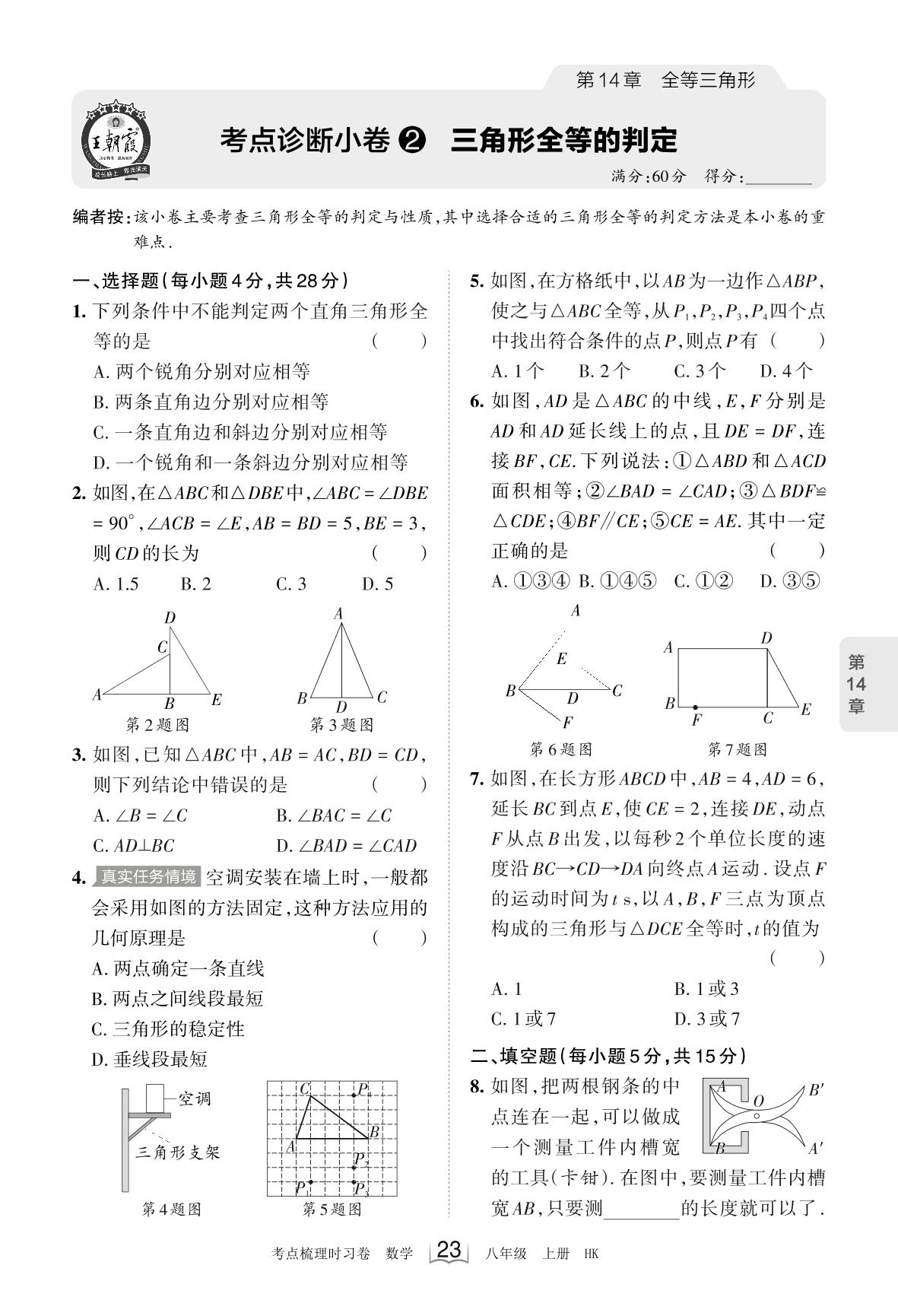 2023上册八年级数学沪科版 第14章 考点诊断小卷2 三角形全等的判定