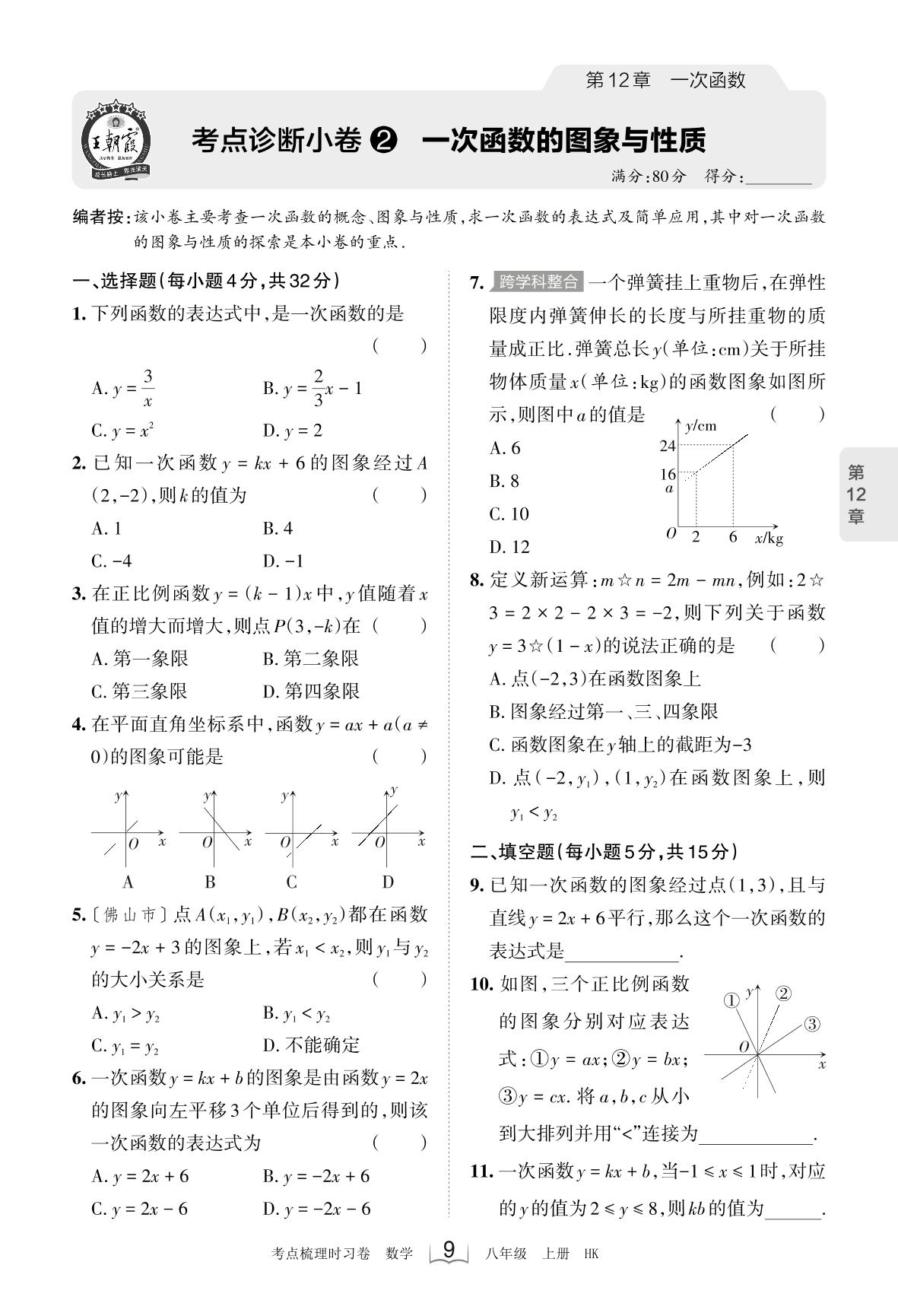 2023上册八年级数学沪科版 第12章 考点诊断小卷2 一次函数的图象与性质