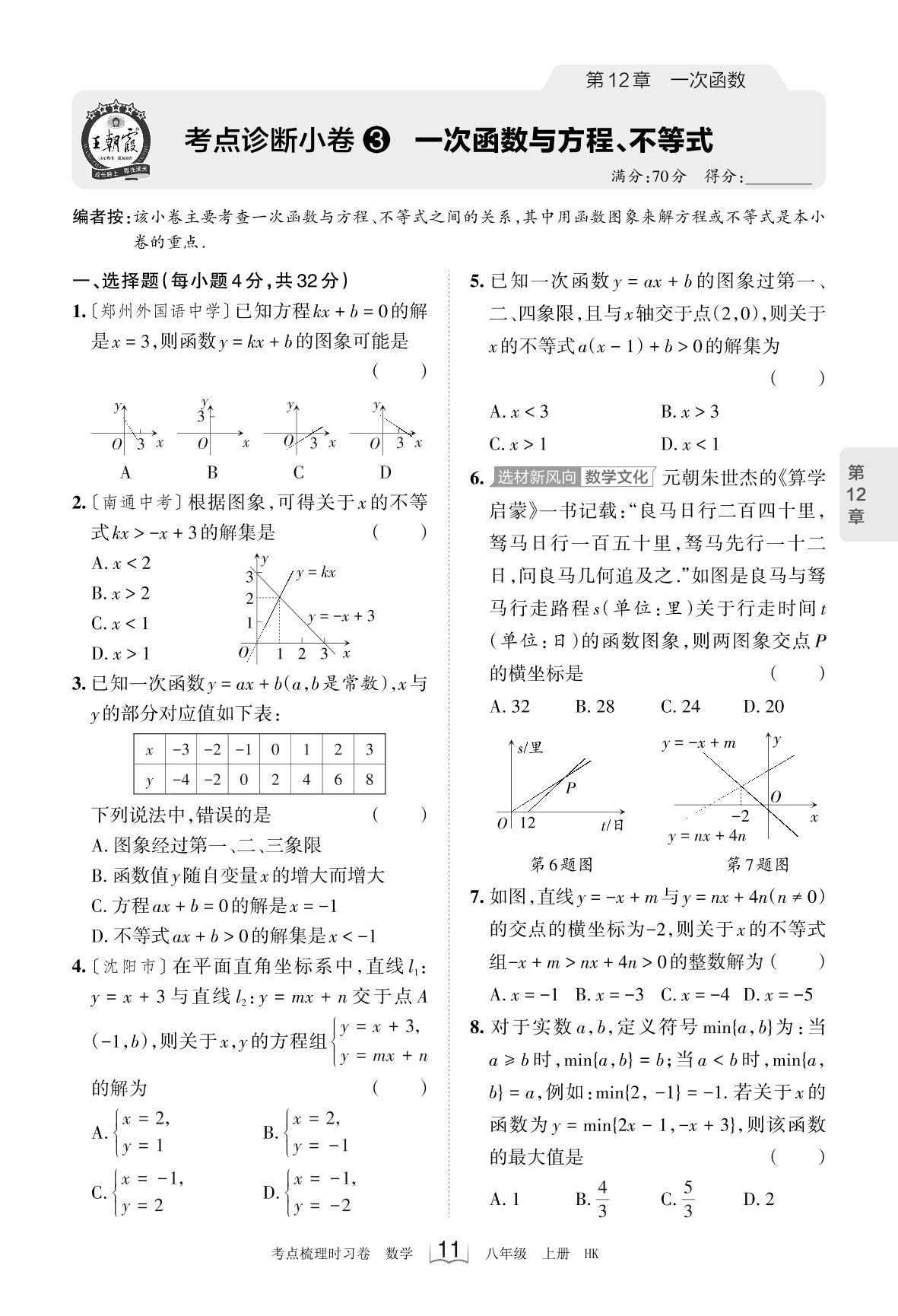 2023上册八年级数学沪科版 第12章 考点诊断小卷3 一次函数与方程、不等式