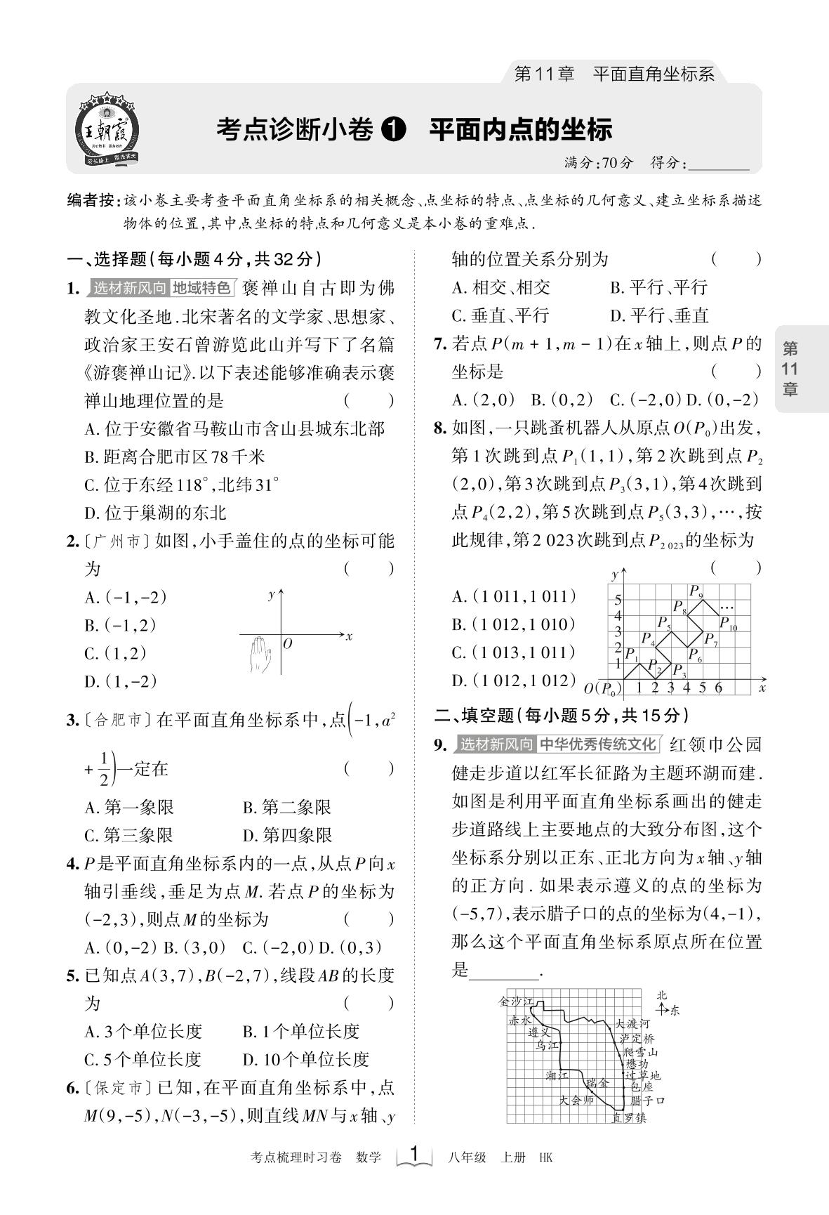 2023上册八年级数学沪科版 第11章 考点诊断小卷1 平面内点的坐标