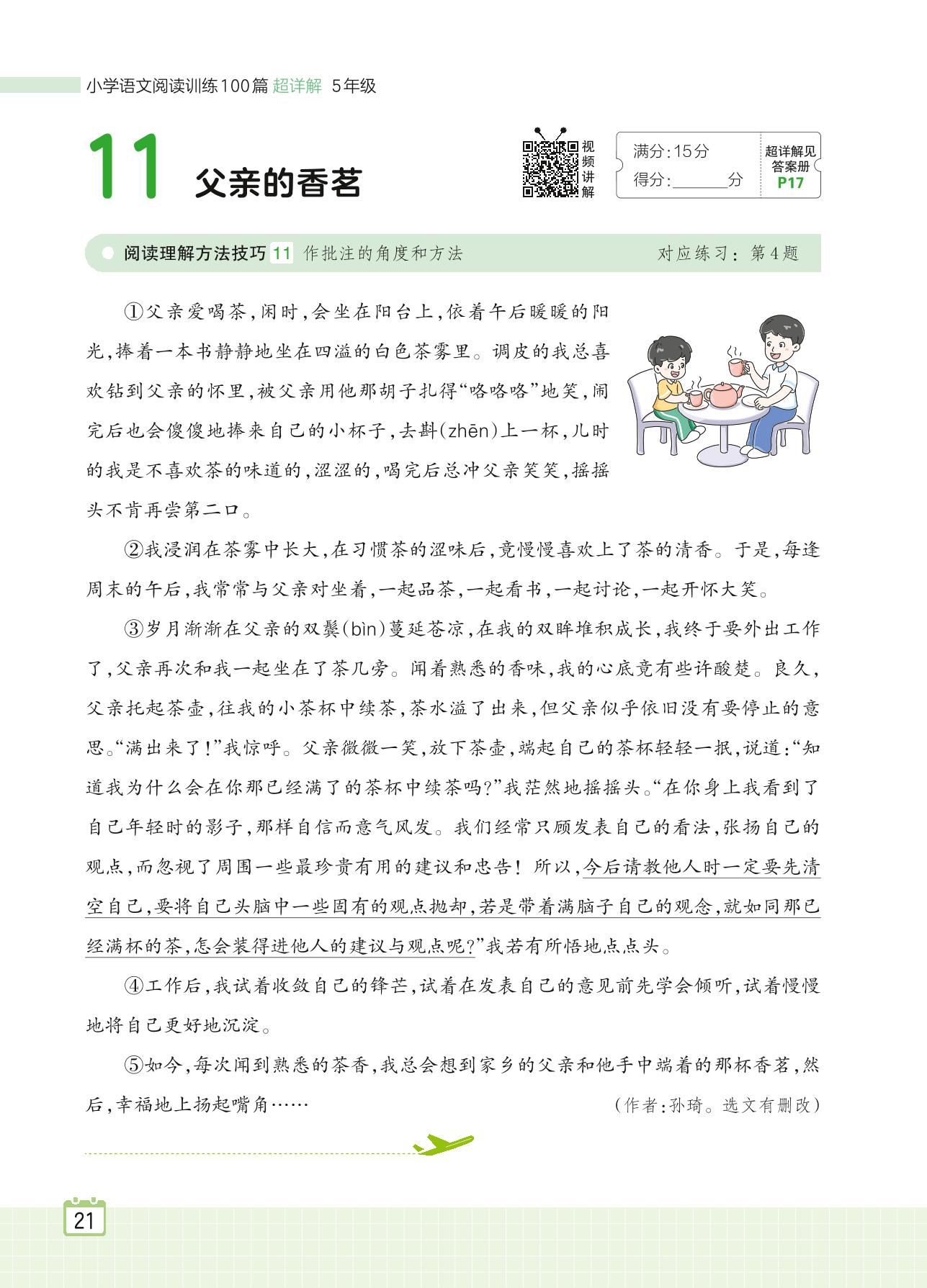 2024全一册五年级语文人教版 专题一 写人 11 父亲的香茗