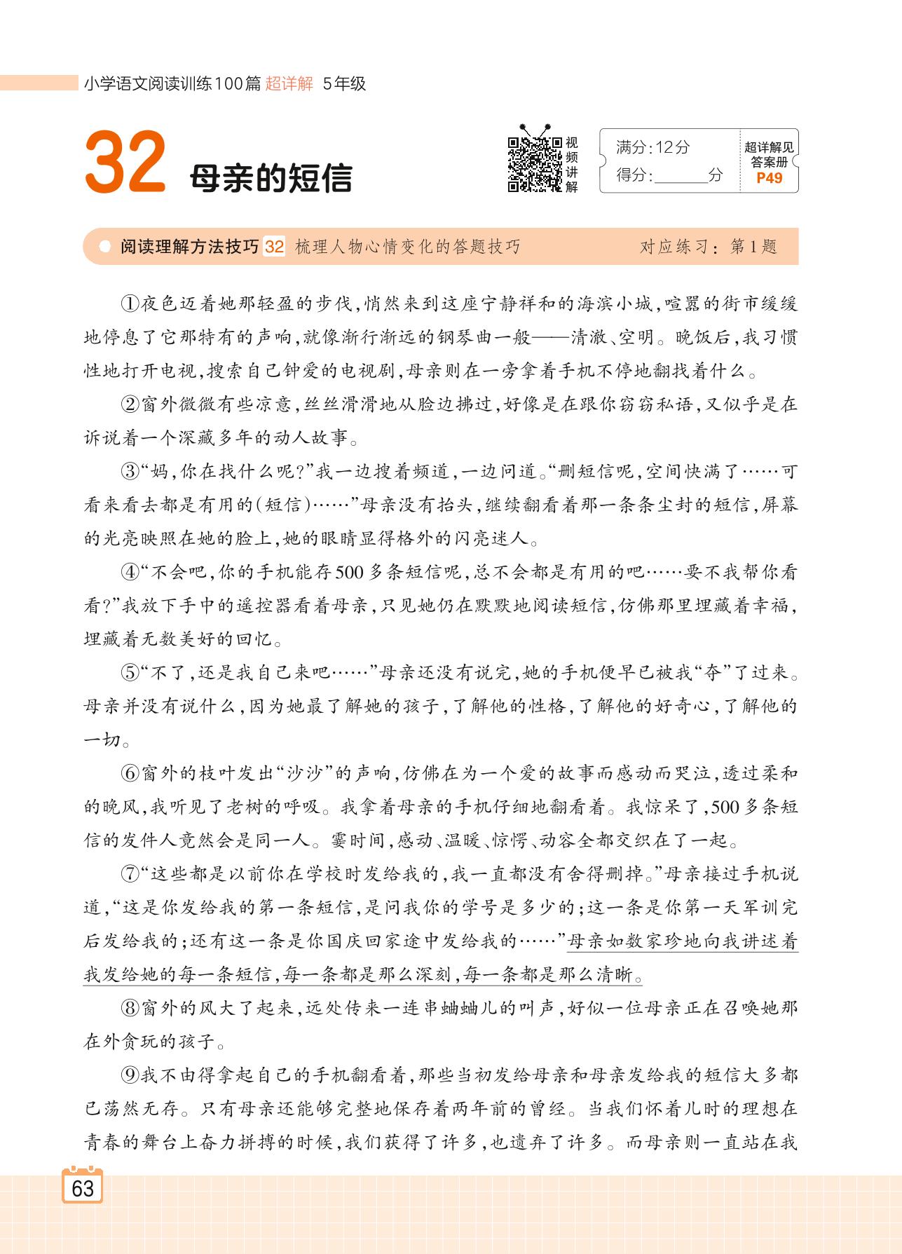 2024全一册五年级语文人教版 专题二 记事 32 母亲的短信