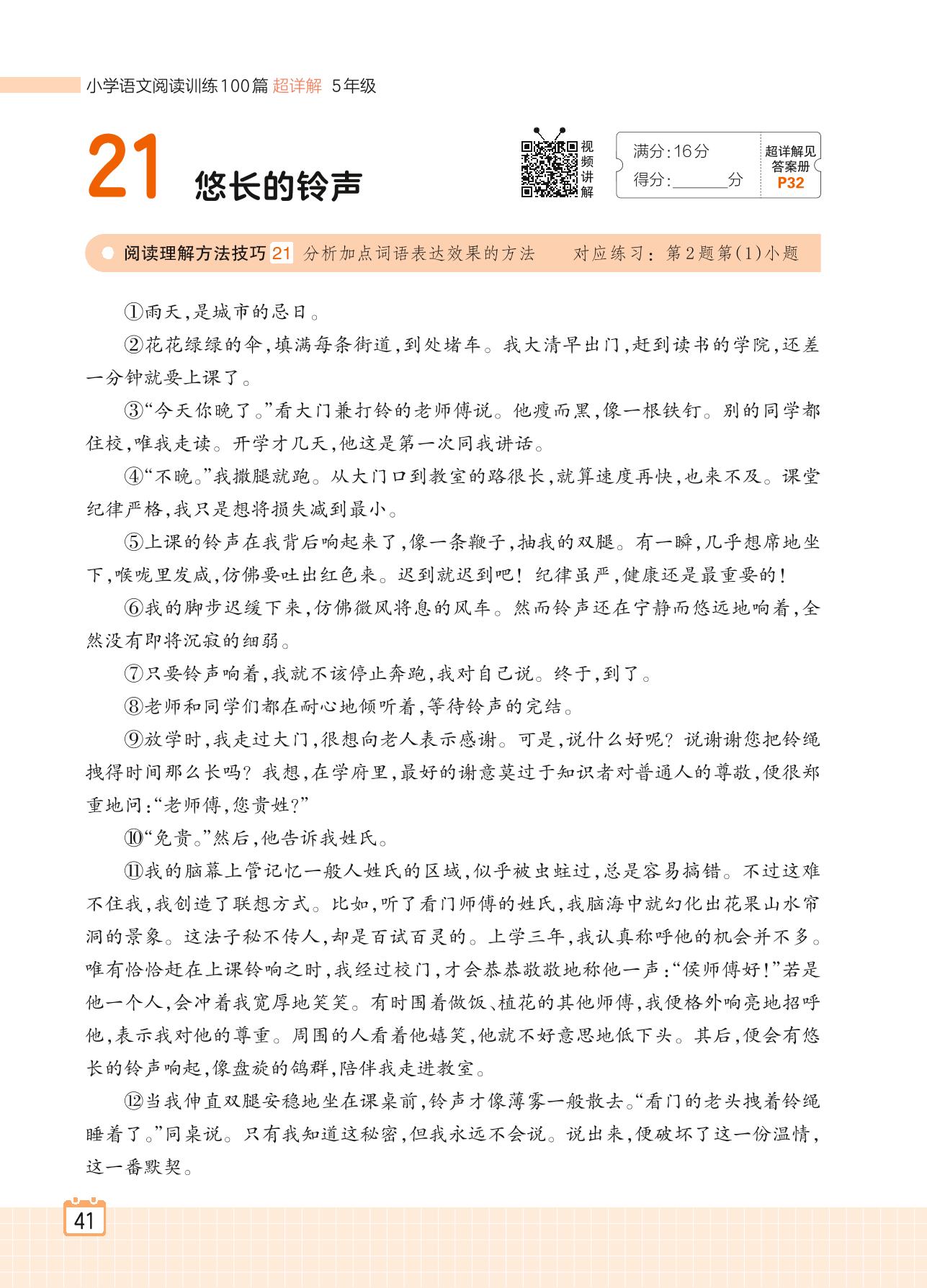2024全一册五年级语文人教版 专题二 记事 21 悠长的铃声