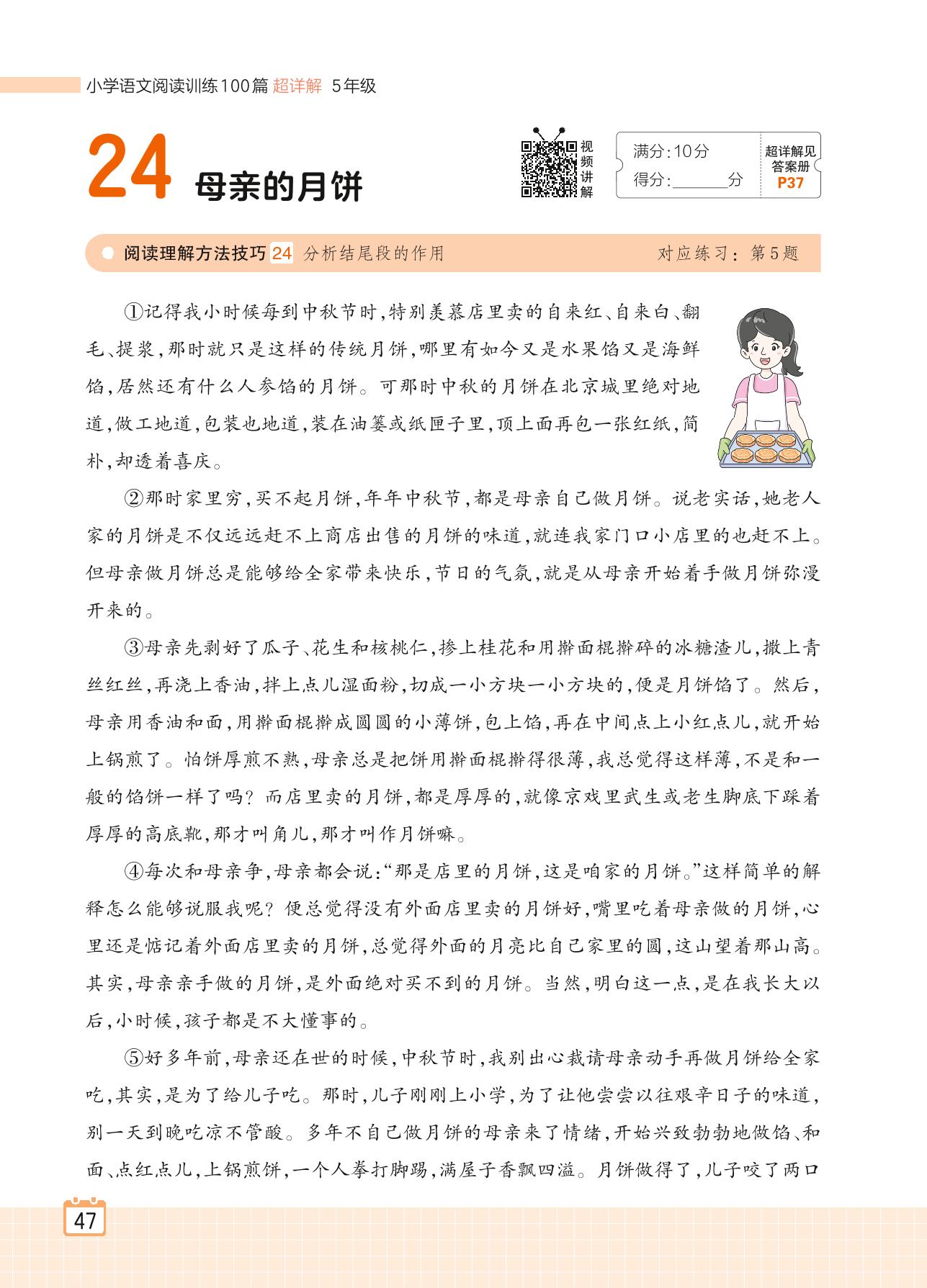 2024全一册五年级语文人教版 专题二 记事 24 母亲的月饼