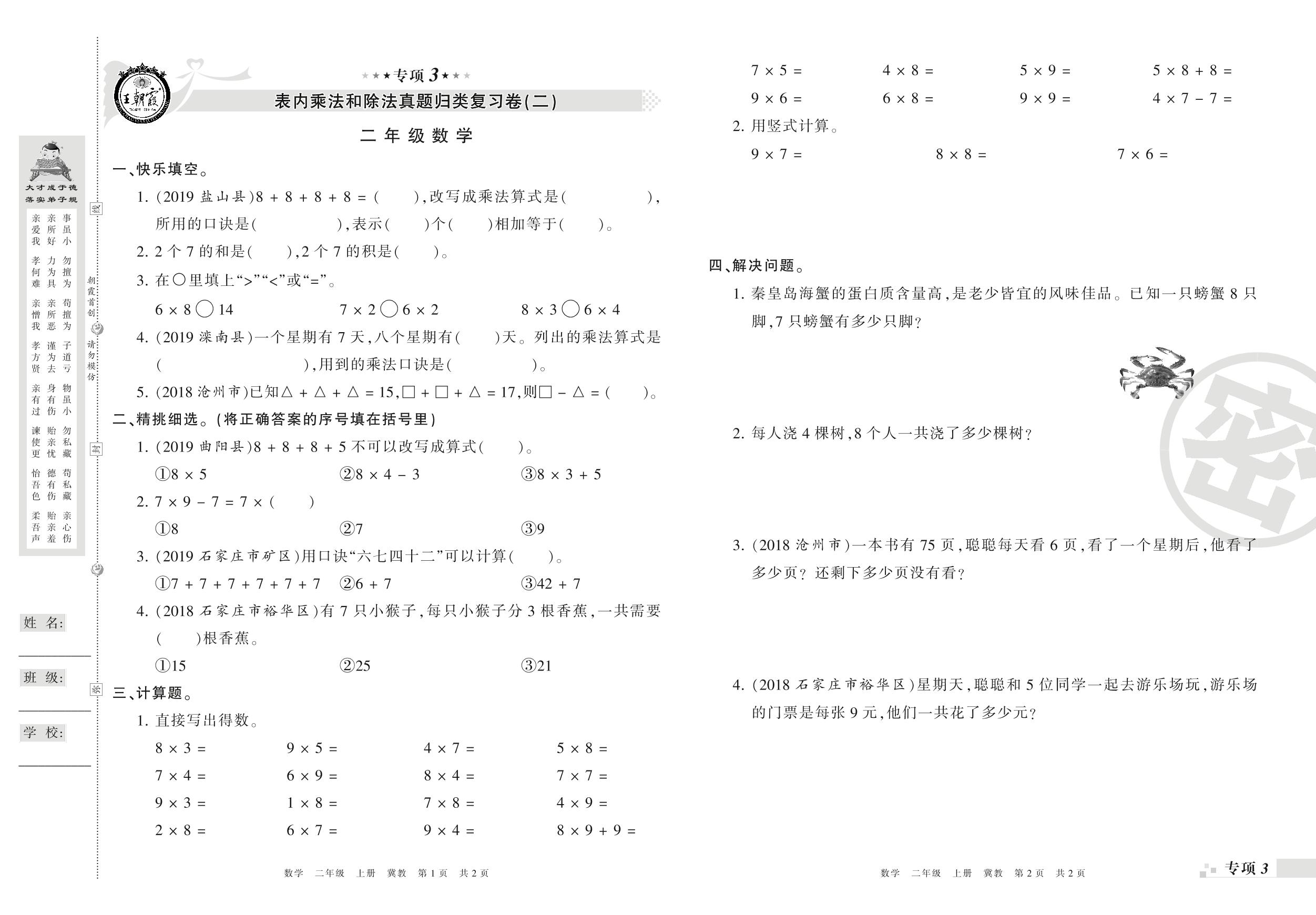 王朝霞期末专项卷——表内乘法和除法真题归类复习二年级上册数学(冀教版)_R21080392748【0】