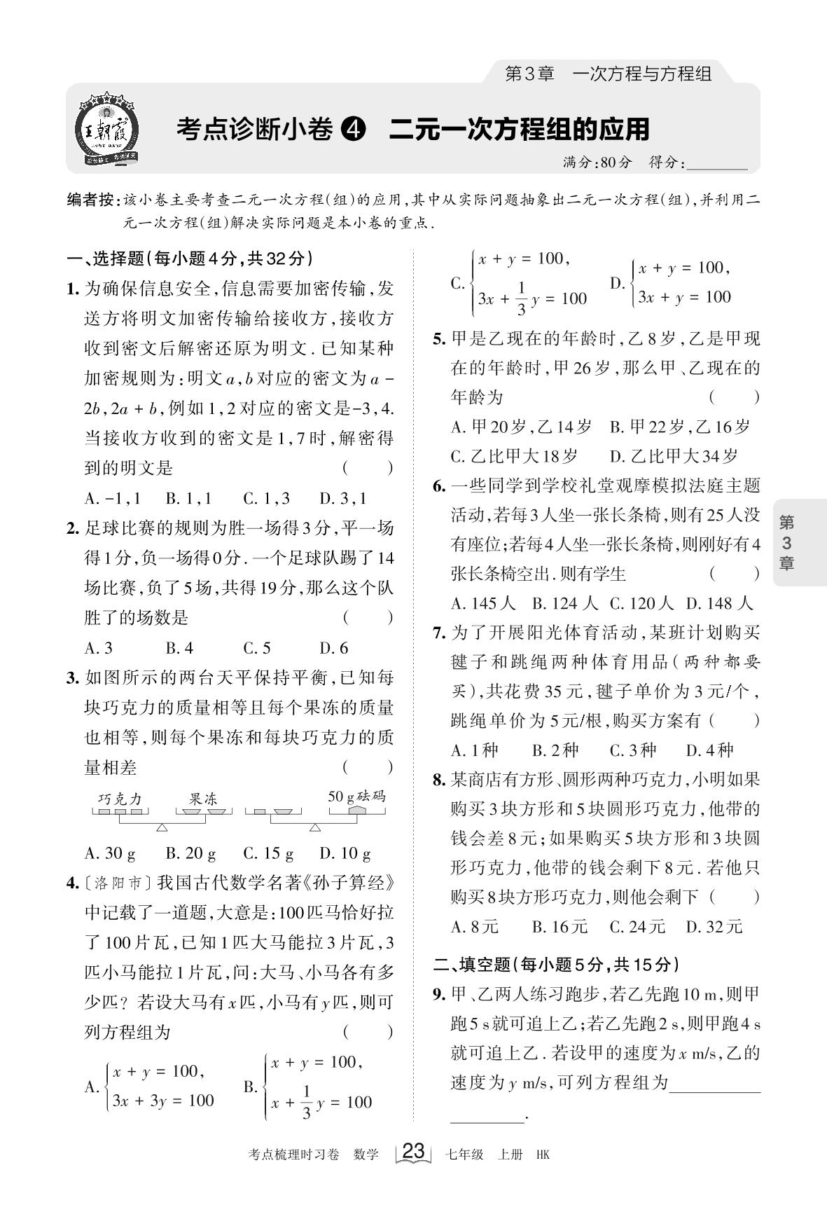 2023上册七年级数学沪科版 第3章 考点诊断小卷4 二元一次方程组的应用