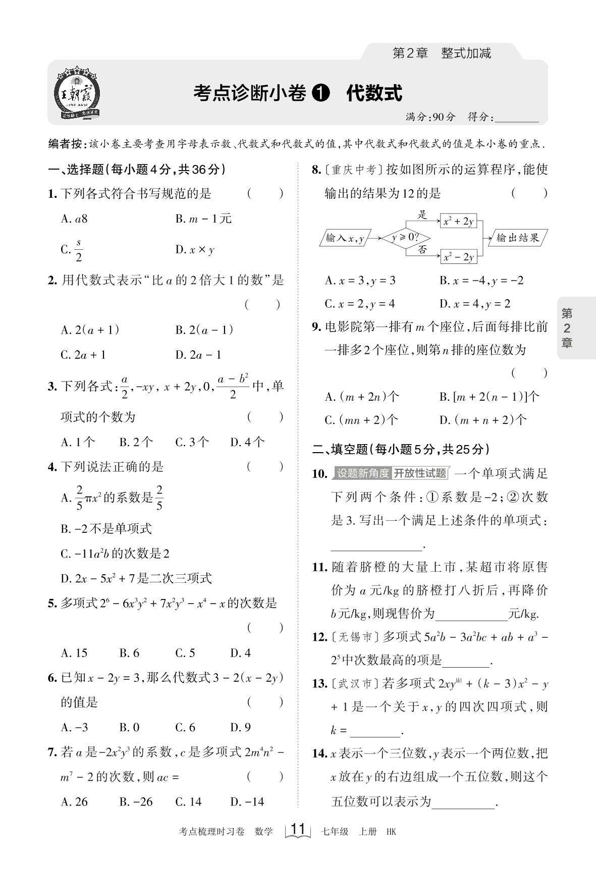 2023上册七年级数学沪科版 第2章 考点诊断小卷1 代数式