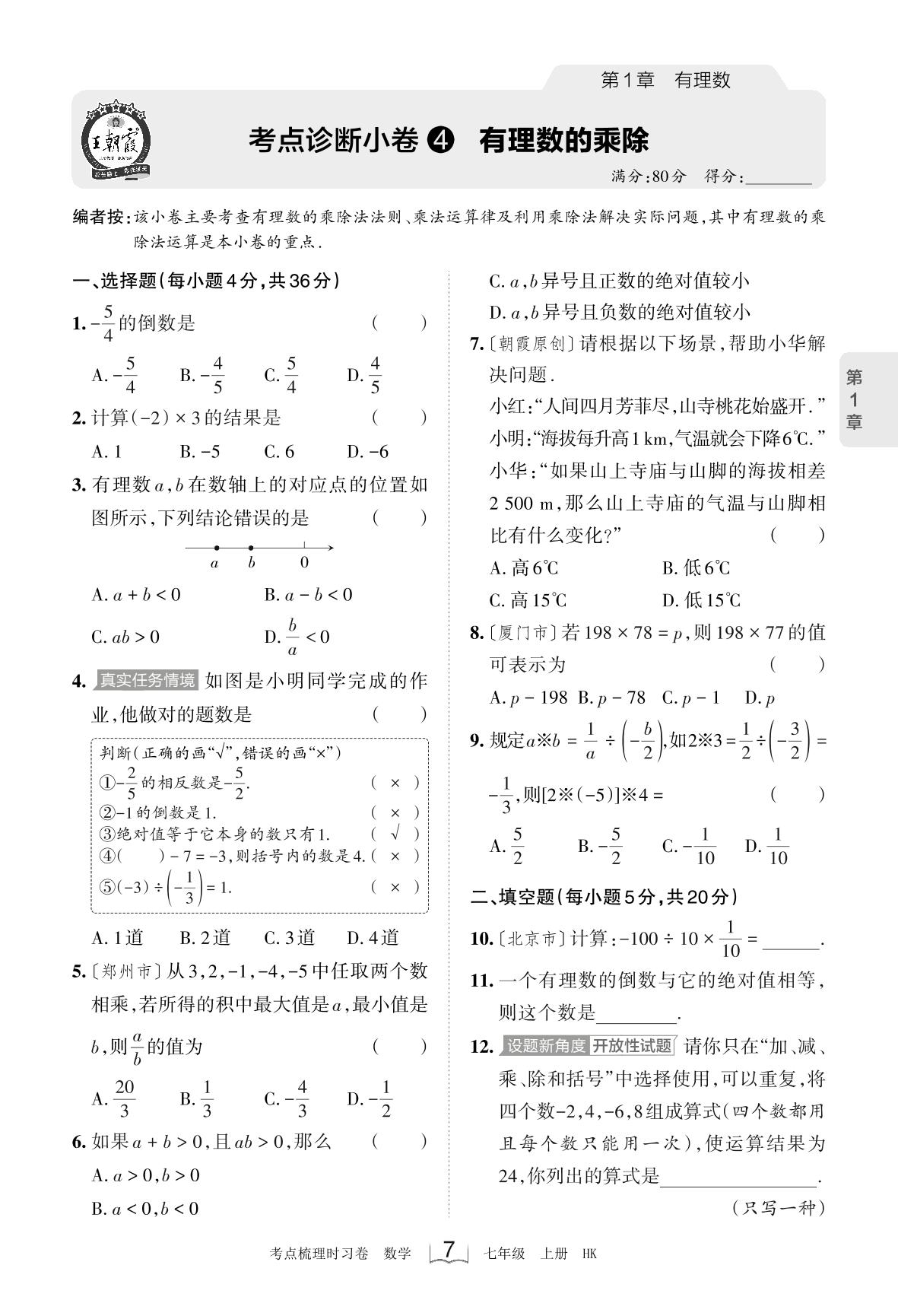 2023上册七年级数学沪科版 第1章 考点诊断小卷4 有理数的乘除