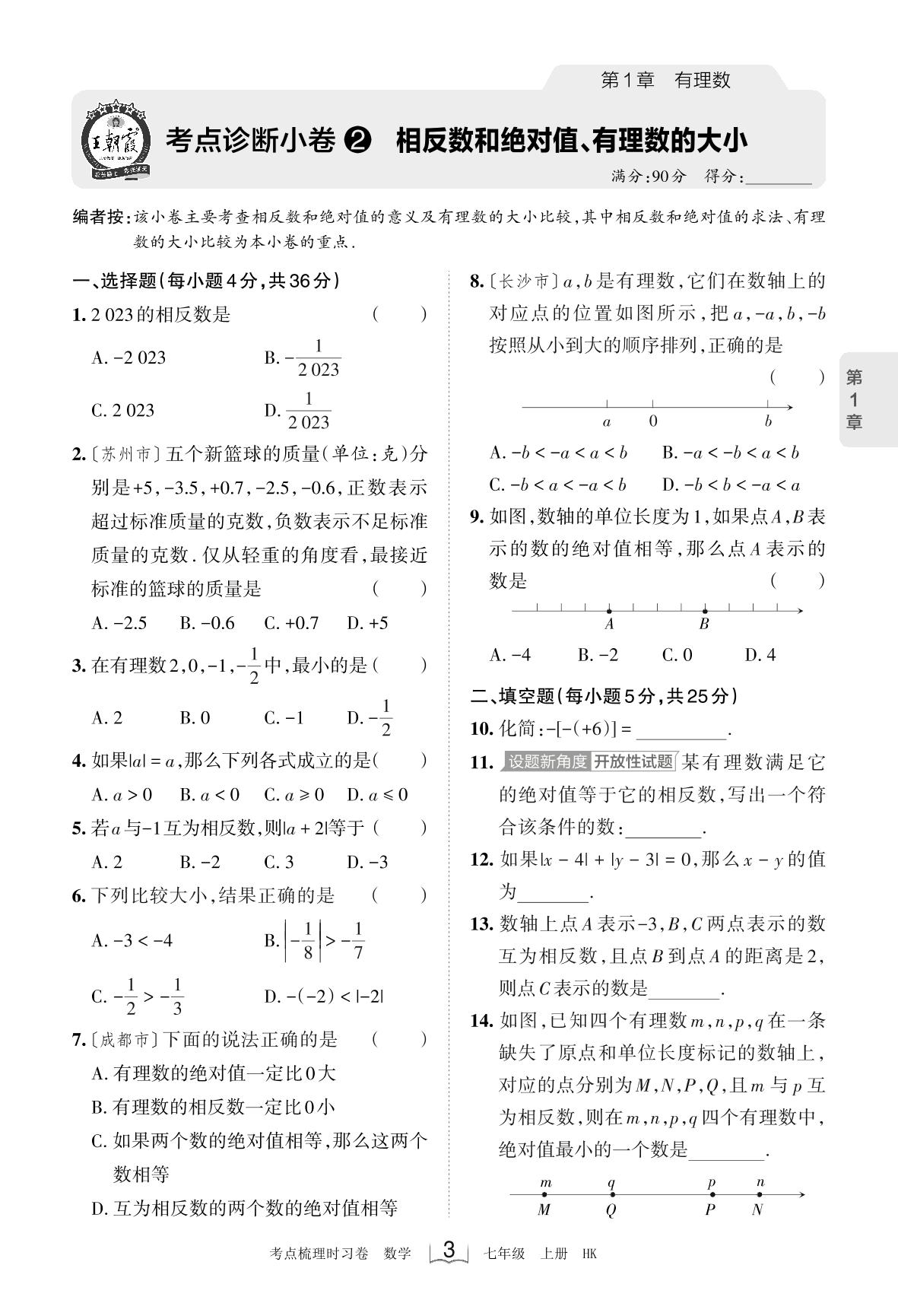 2023上册七年级数学沪科版 第1章 考点诊断小卷2 相反数和绝对值、有理数的大小