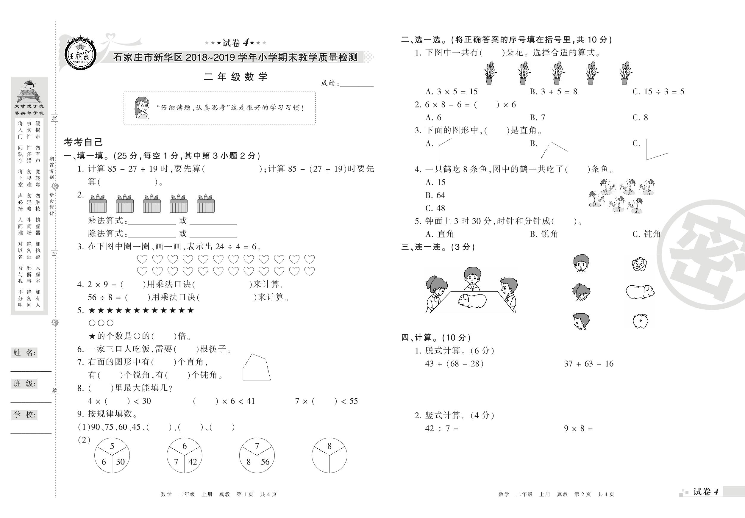 2018-2019学年第一学期石家庄市新华区二年级数学试卷(冀教版)【4】