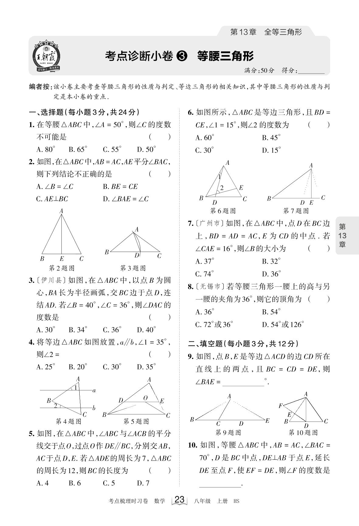 2023上册八年级数学华师版 第13章 考点诊断小卷3 等腰三角形