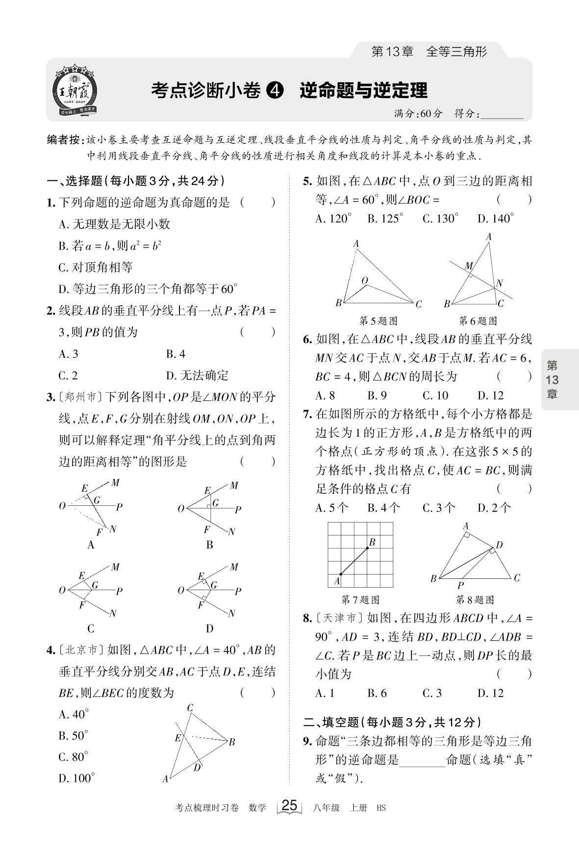 2023上册八年级数学华师版 第13章 考点诊断小卷4 逆命题与逆定理
