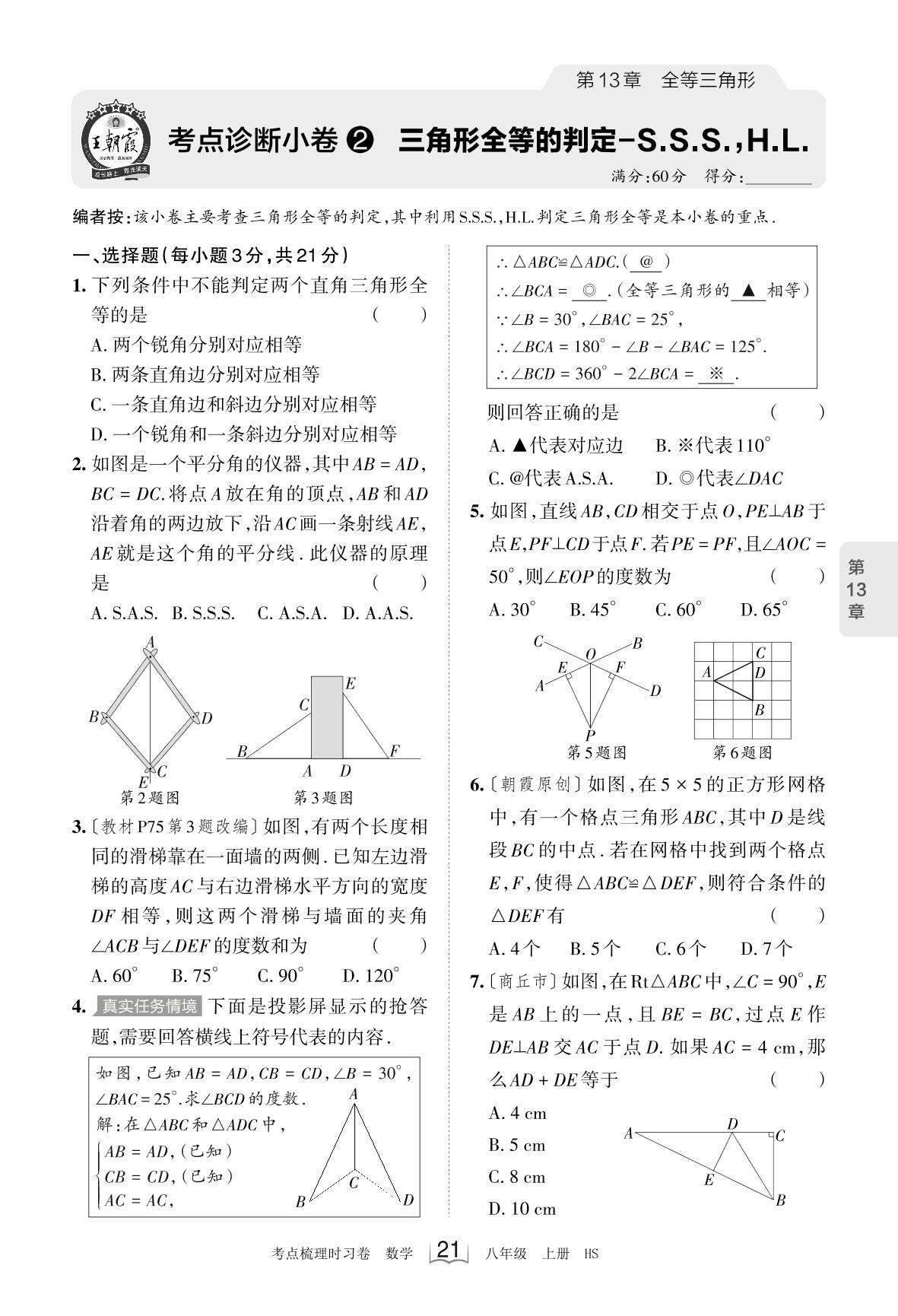 2023上册八年级数学华师版 第13章 考点诊断小卷2 三角形全等的判定—S.S.S.,H.L.